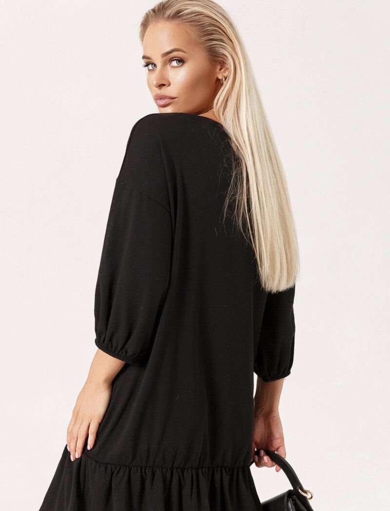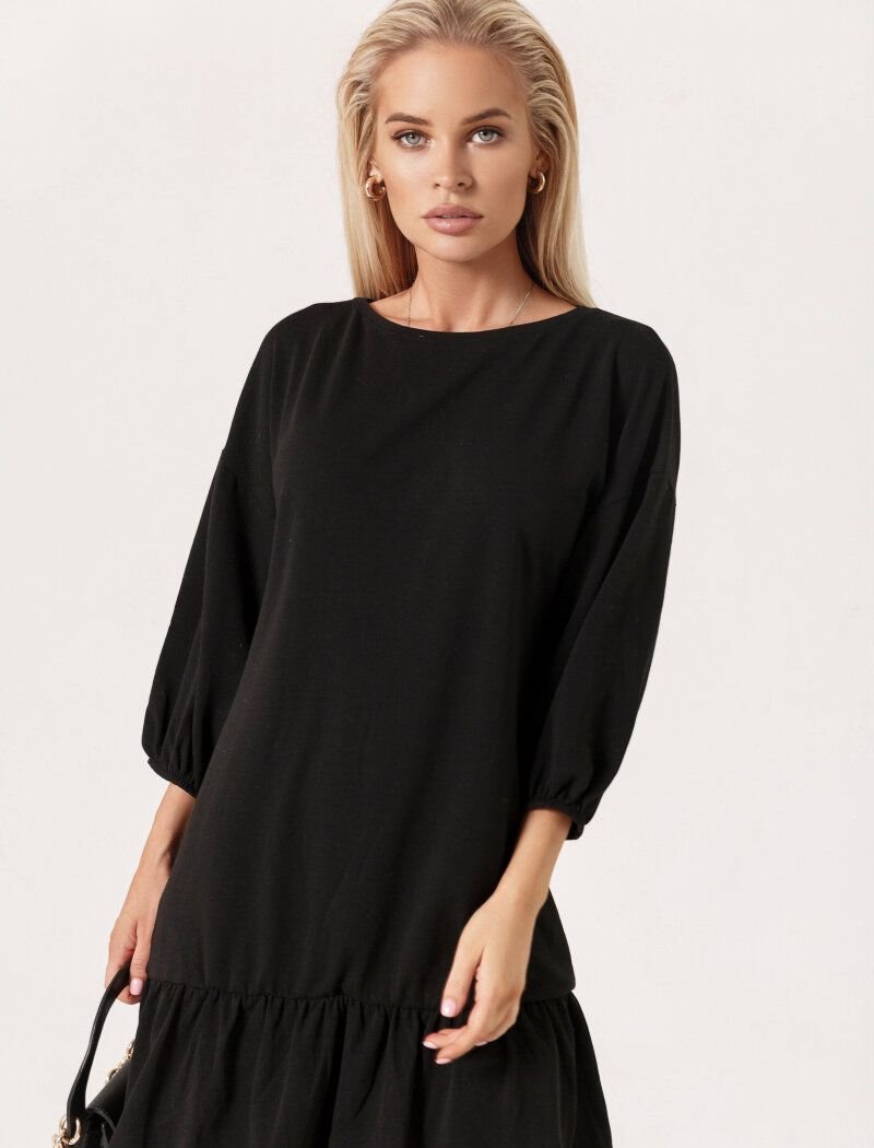In creating a black mini dress, the main bet is made on comfort and conciseness of the style. The model with a round neck, 3/4 sleeves on elastic cuffs is sewn from a light knitted material. The airiness of the product was given with the help of a shuttlecock, effectively framing the hem.