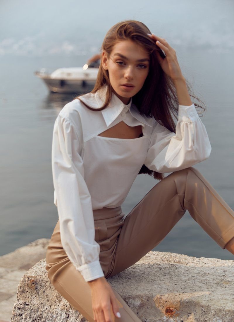 White cotton shirt of the original cut, made of cotton fabric. Gepur designers offer a new reading of the basic shirt! The classic stand-up collar dilutes the curly neckline on the chest. A puffy sleeve with a button closure adds its own zest to the model. The length of the hem makes it possible to wear the shirt tucked and straightened.