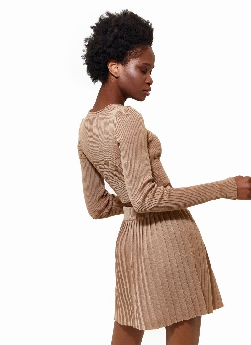 A beige knitted suit is presented with a pleated mini skirt and a shortened longsleeve. Such a set harmoniously fits into the image both as a basis and as separate elements.