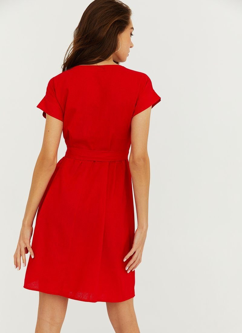 The dress is a win-win option for a casual summer look. Flaming red color, loose silhouette and light material will help to make the right impression. To emphasize the waistline will allow a belt-ribbon to match.