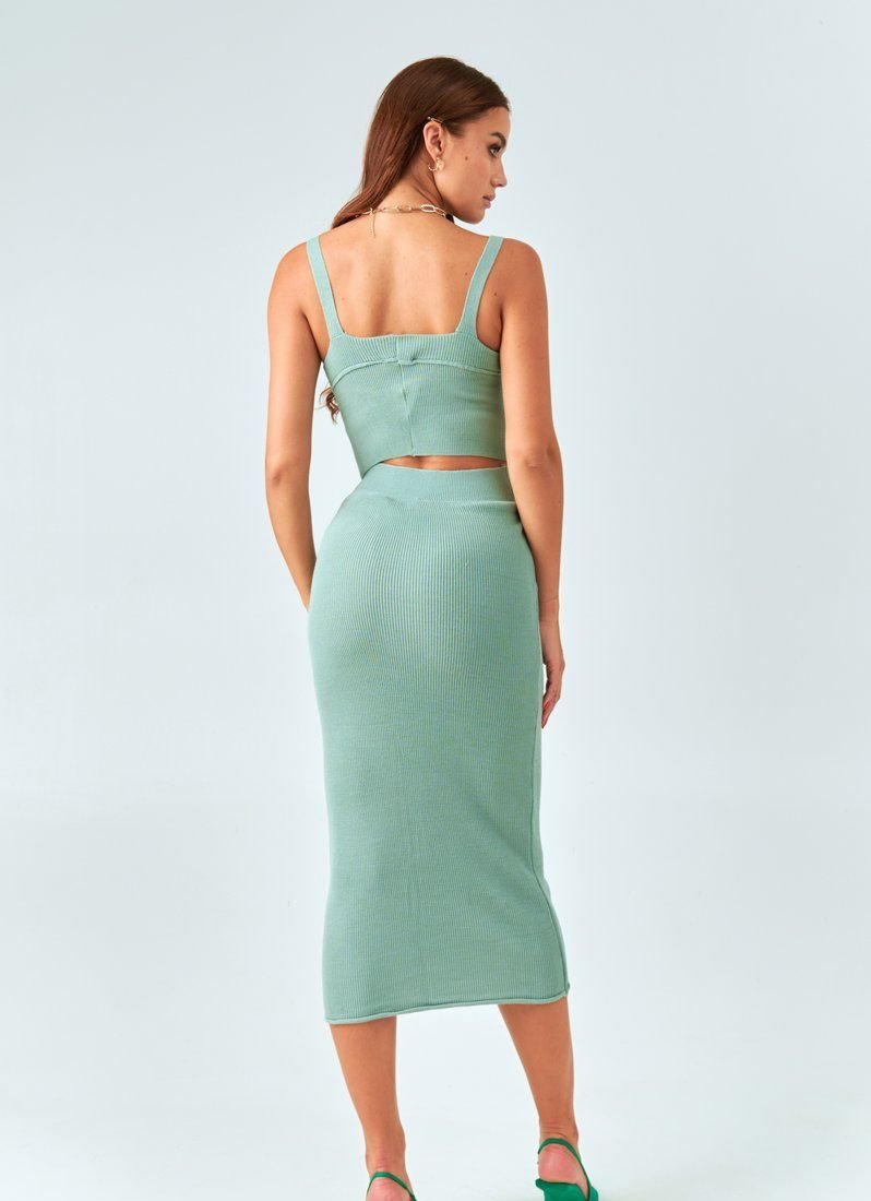 The actual set of a soft green shade, made of soft textured knitwear. The set includes a tight midi length skirt, a top and a cropped cardigan with long sleeves.