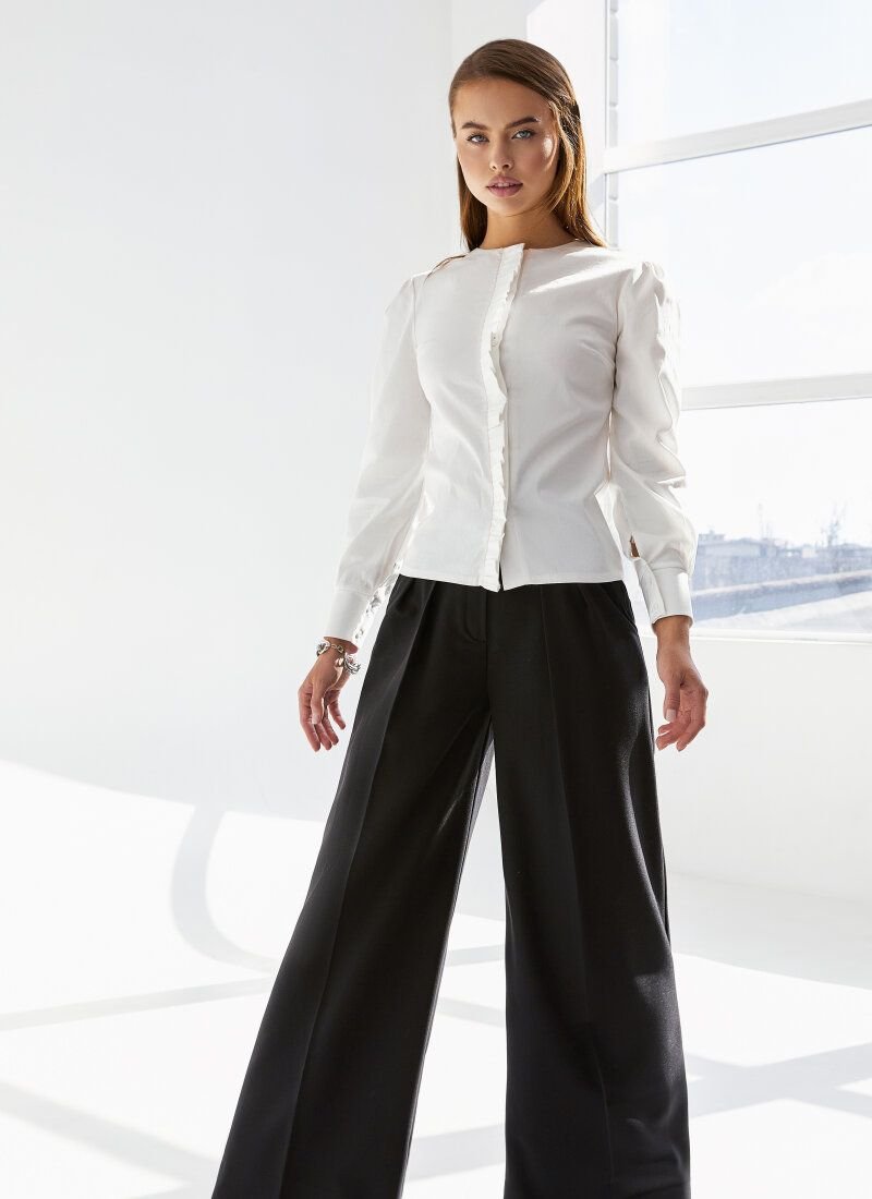 The blouse of a milky shade is made of blended cotton - a pleasant and durable material that holds its shape well. A hidden plank with an openwork frill acts as a decor. The round neckline supports the brevity of the model.