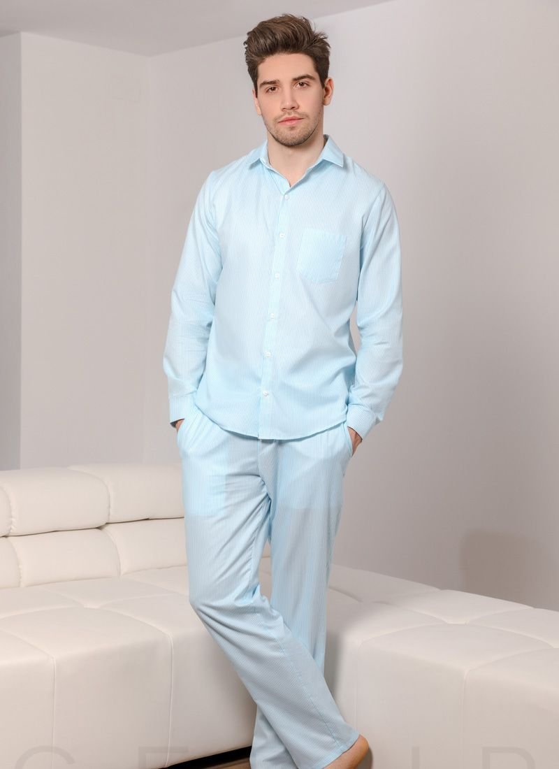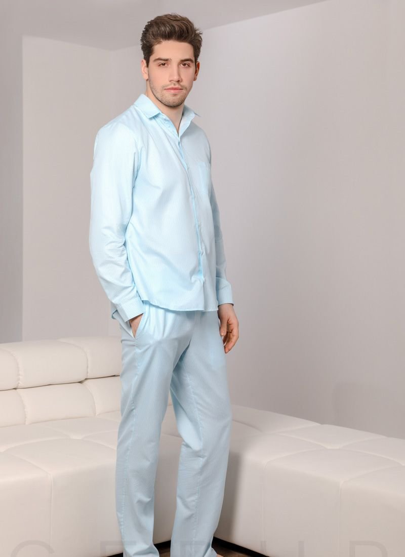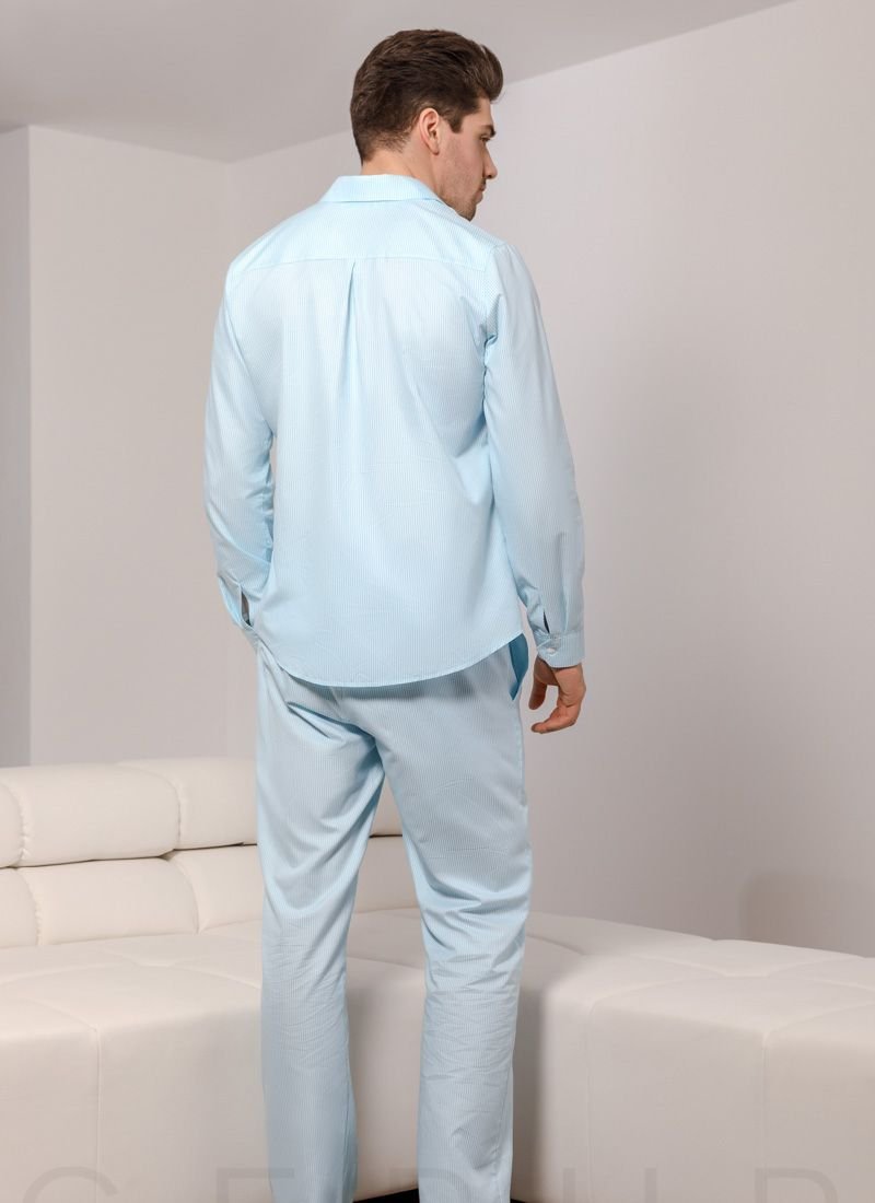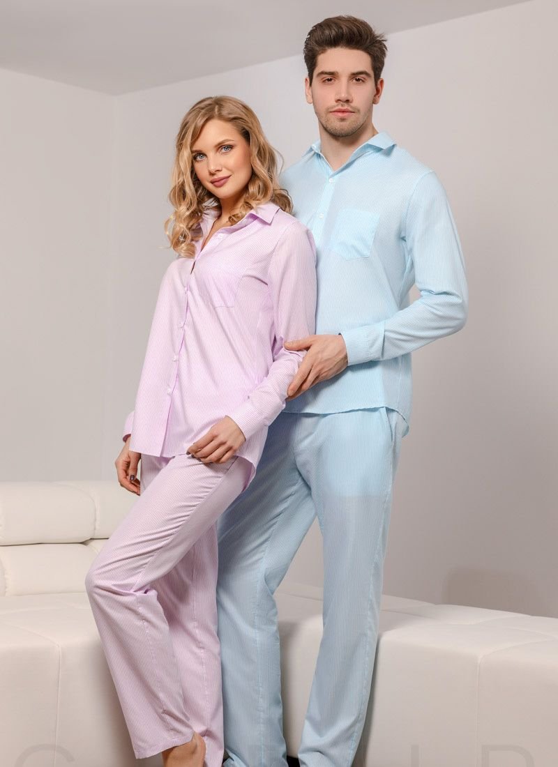 Comfortable striped pajamas from Gepur designers: a classic button-down shirt with a stand-up collar and a small patch pocket on the chest, light trousers with an elastic waistband with ties and two welt pockets on the sides.