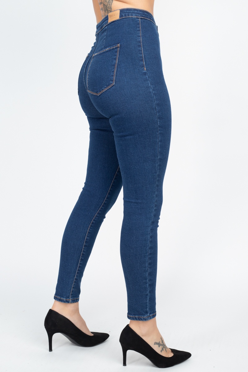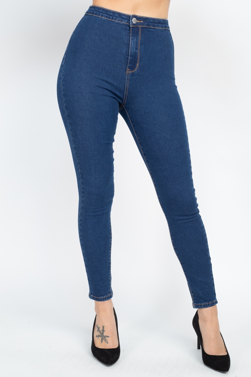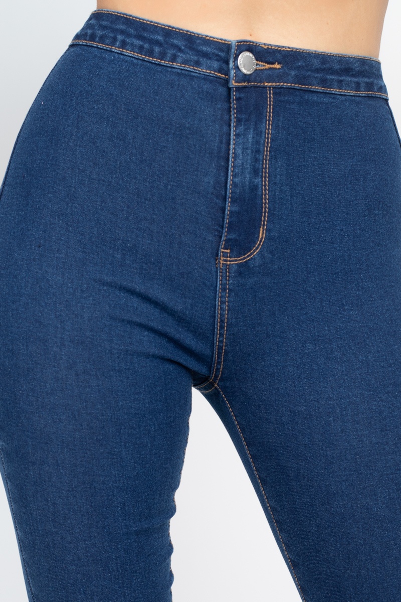 Imported1.3.5.7.9.11.13A woven jean featuring elastic material, high waist, front zip closure, and welt pockets.65% Cotton 33% Polyester 2% SpandexDark DenimIRI