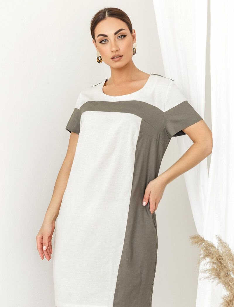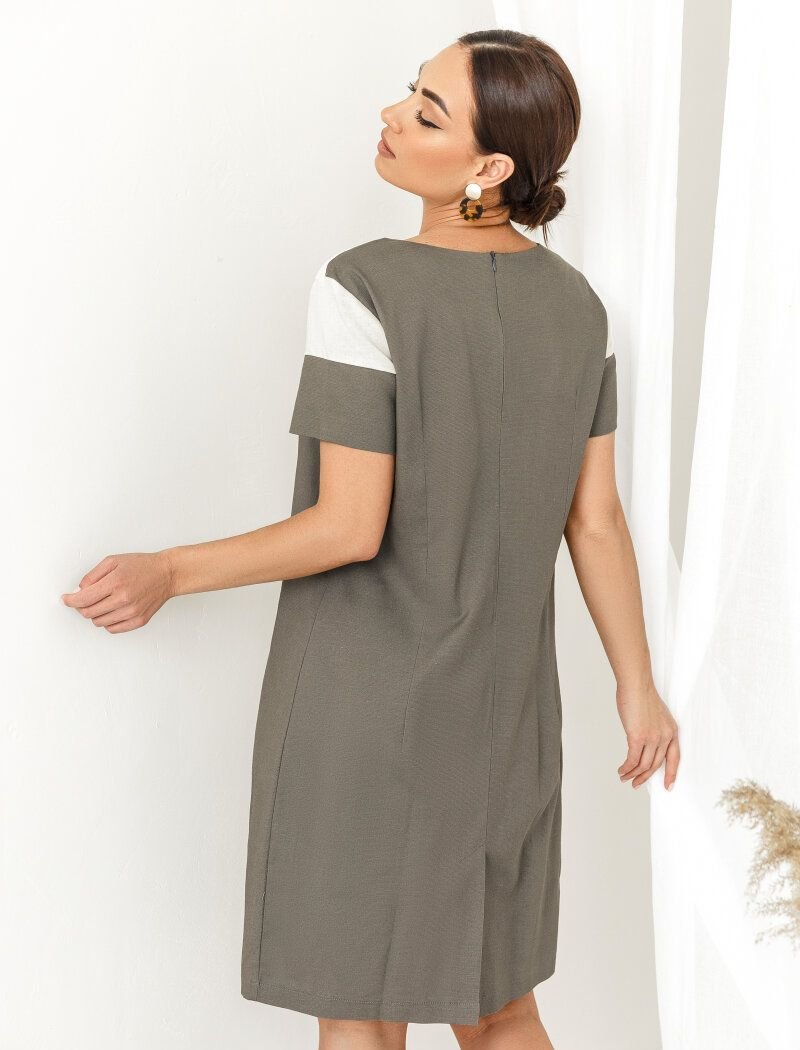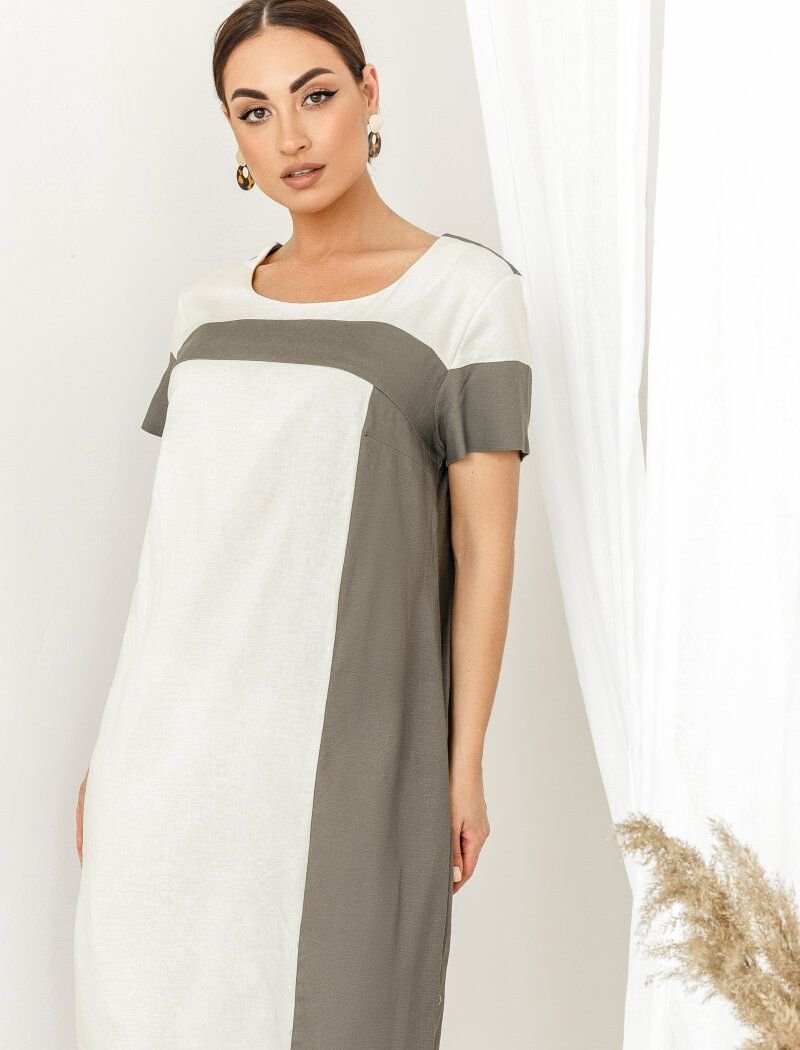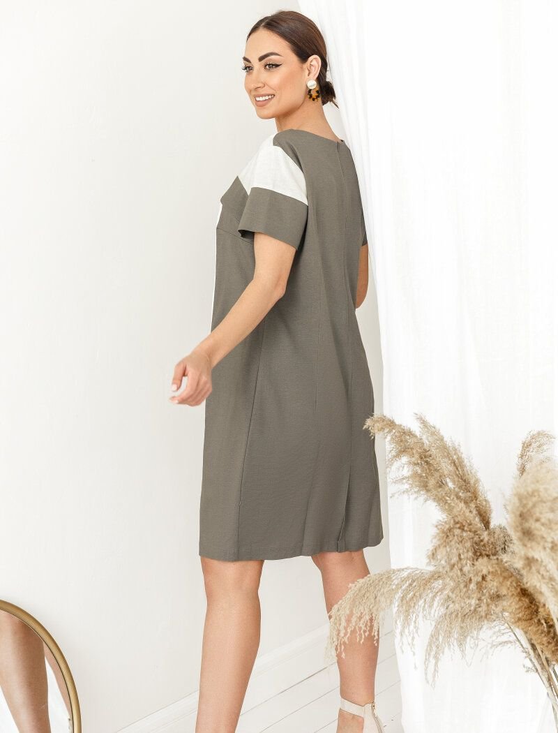 Casual mini dress with a straight cut. Deep round neck and short sleeve. The tone of the model is set by a combination of white and #808080
