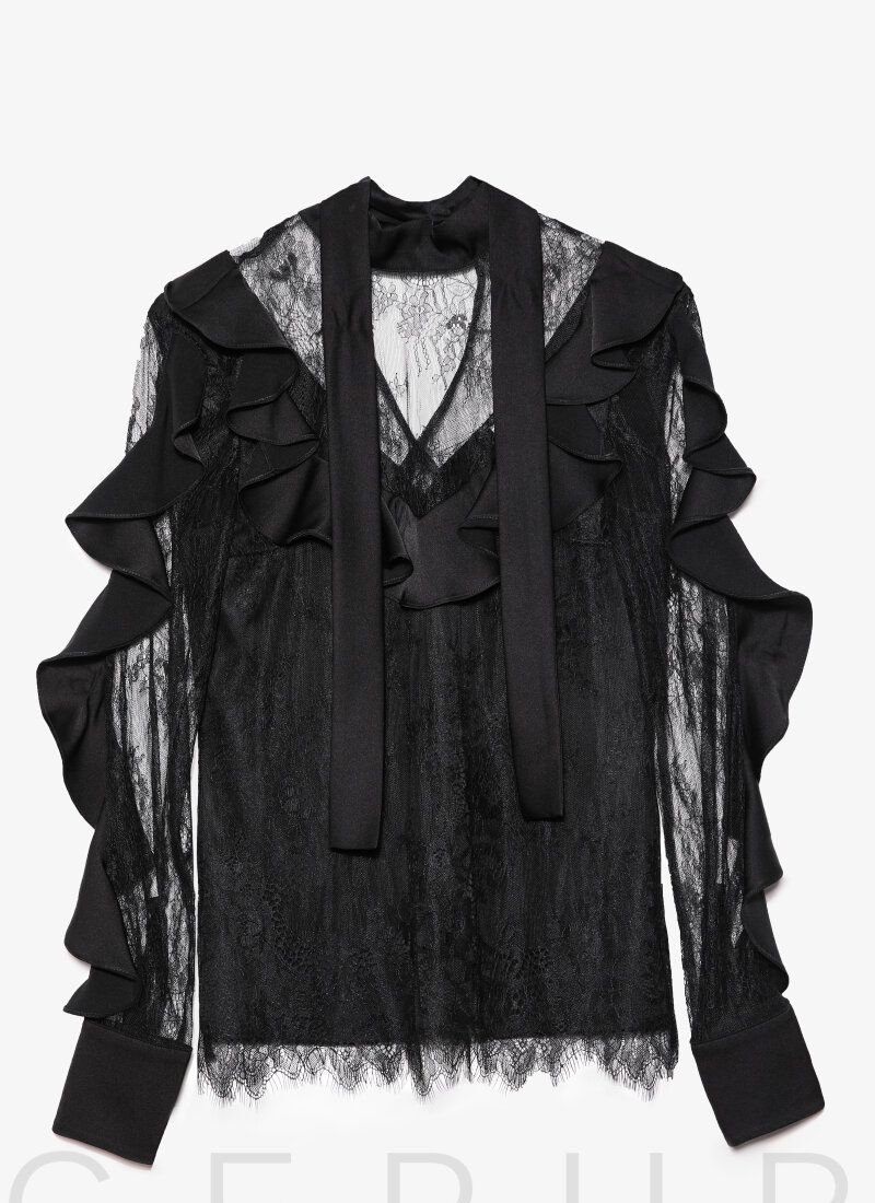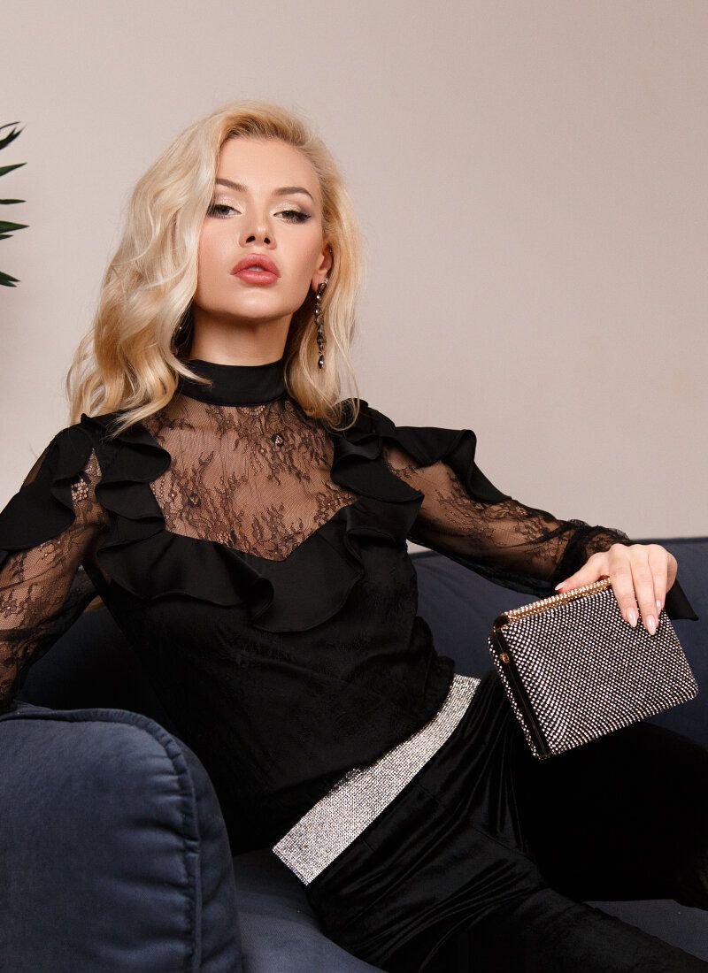 For the production of a monochrome model, the masters of the Gepur brand preferred weightless and such a pleasant artificial silk to the body. It is harmoniously combined with the finest lace, complemented by floral motifs. This blouse has become a real anthem of femininity. And exquisite ruffles and elegant ties added even more tenderness and romance to the product.