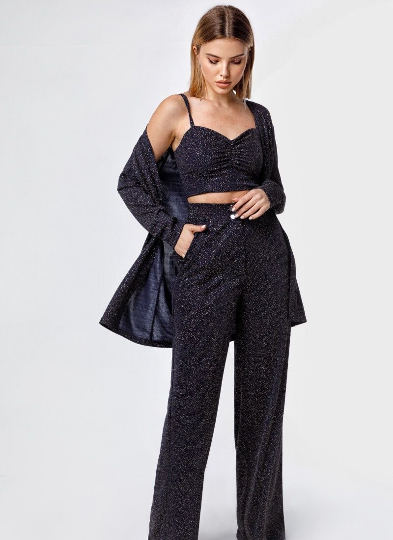 A blue suit with shimmering dusting is a win-win solution for creating a spectacular evening look. The set consists of three elements: palazzo trousers, a top with thin straps and a loose cardigan. Elastic inserts provide a comfortable fit on the figure. The trousers are complemented by side pockets.