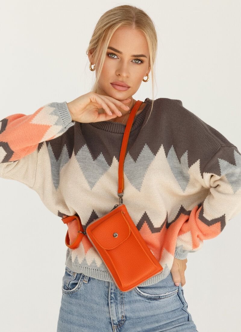 A cropped jumper with a geometric pattern will be indispensable in cool weather or on vacation in the mountains. It's all about the warm yarn, which warms and has a smooth texture. A loose-fitting model with a deflated shoulder line.