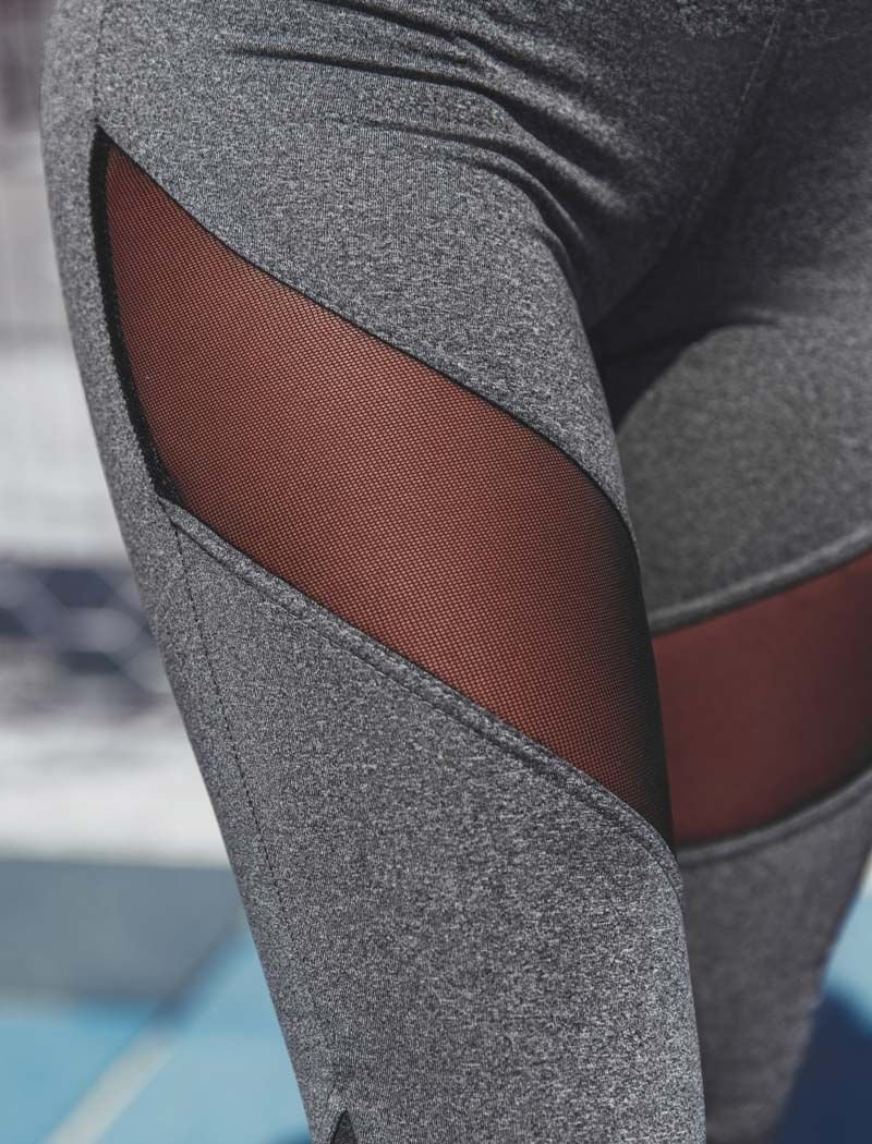 Modeling leggings with a high fit and transparent inserts in the front.