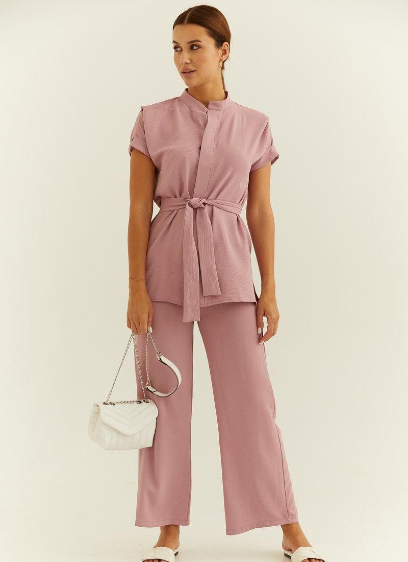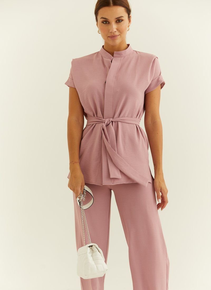 A powdery suit will easily become the basis of a comfortable everyday bow. The model consists of loose-fitting trousers and an elongated shirt with short sleeves, complemented by a removable belt-ribbon. The main feature of the shirt is a hidden button closure, which gives the image its conciseness.