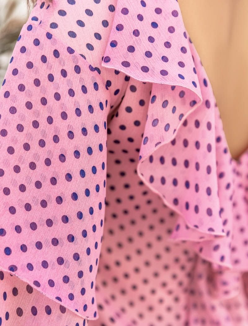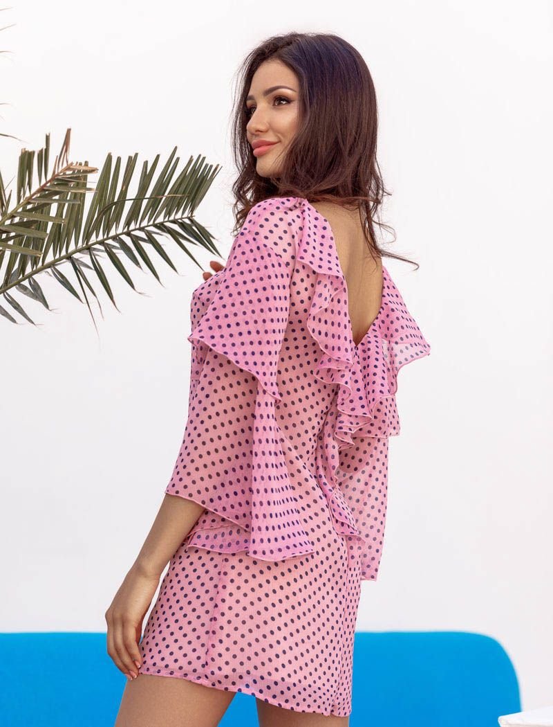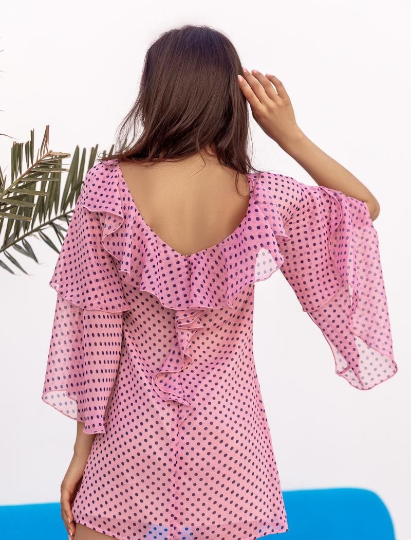 A stylish mini dress with a straight cut, made of flowing chiffon fabric in a pea print, from Gepur designers: a round neck in front and a neat v-shaped back, complemented by a weightless flounce, a flared long sleeve.