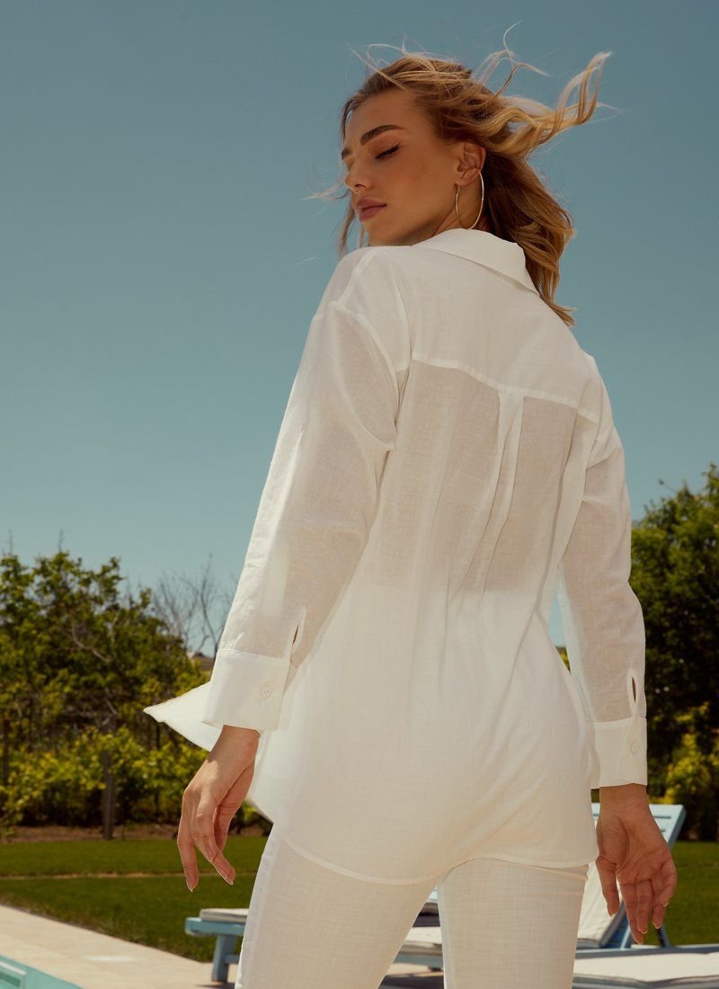 A milky-colored beach shirt from Gepur designers is the perfect solution for the summer period. The use of light natural fabric allows you to wear a shirt even in the hot period. The length of the sleeve can be easily adjusted with the help of pata fasteners, and the slits on the sides can tie the shirt at the waist. The original buttons, covered with fabric to match the shirt, add their own peculiarity to the product.