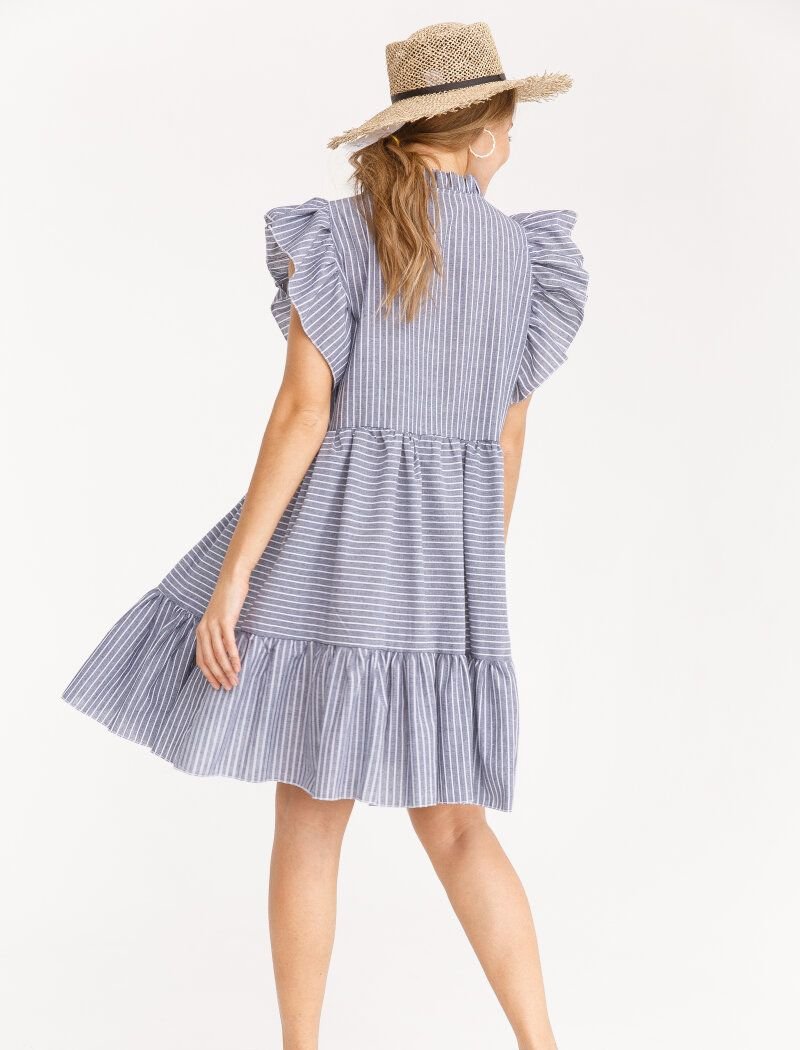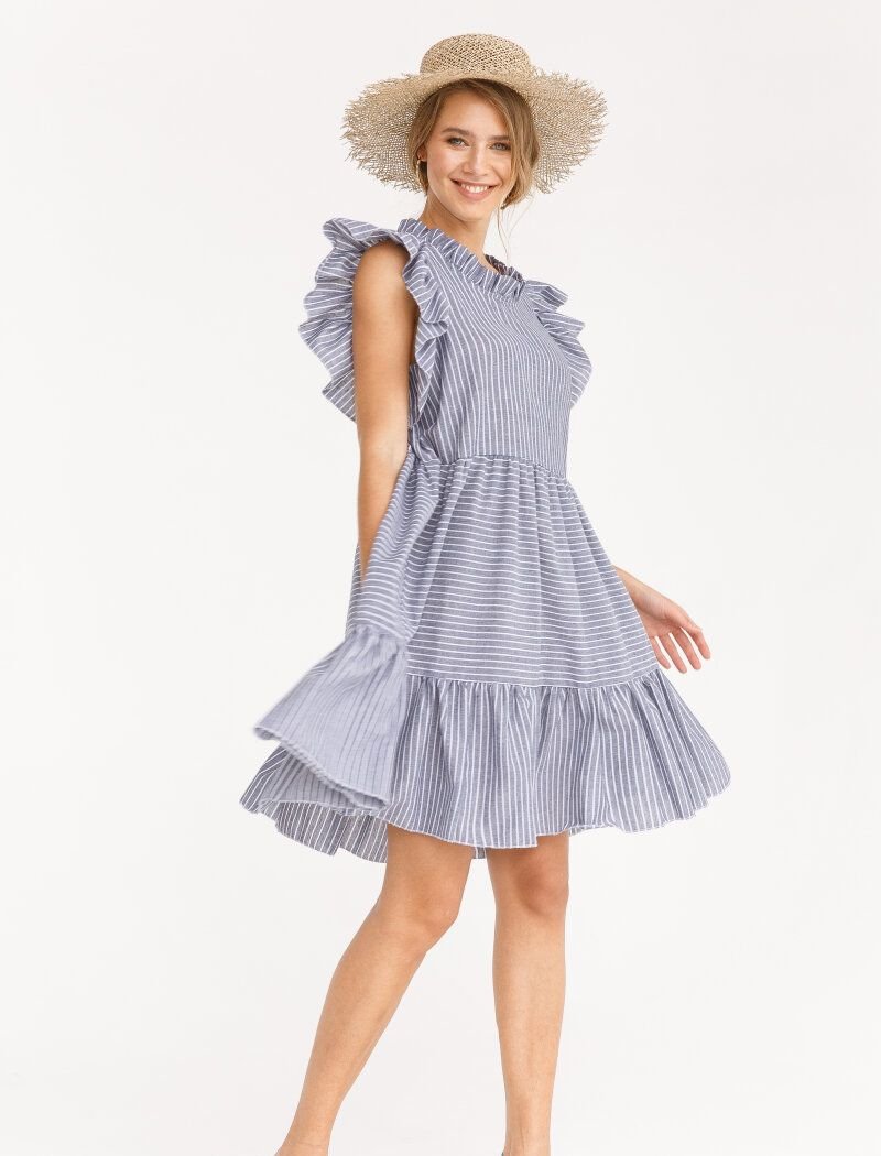 Loose linen dress of universal size. Round collar, decorated with a sophisticated frill. Short flounce sleeves, cut-off waist with a multi-tiered skirt.