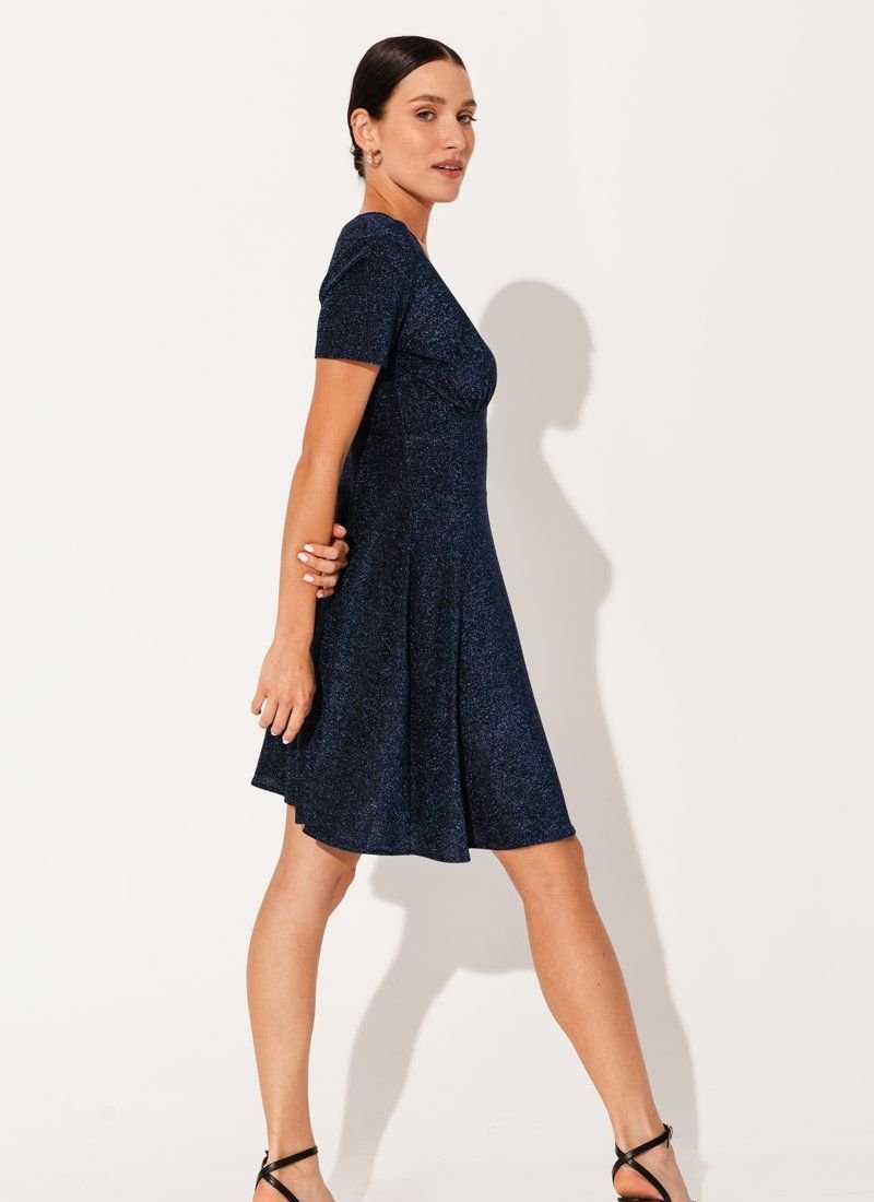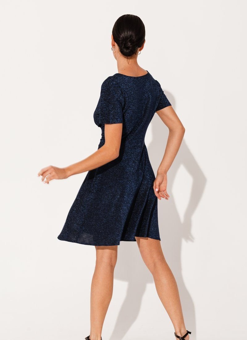 A small blue dress creates a wow effect, due to a fitted silhouette, a v-shaped deep neckline and a wide waistband. The shimmer created by the material with lurex also acts as a decor.