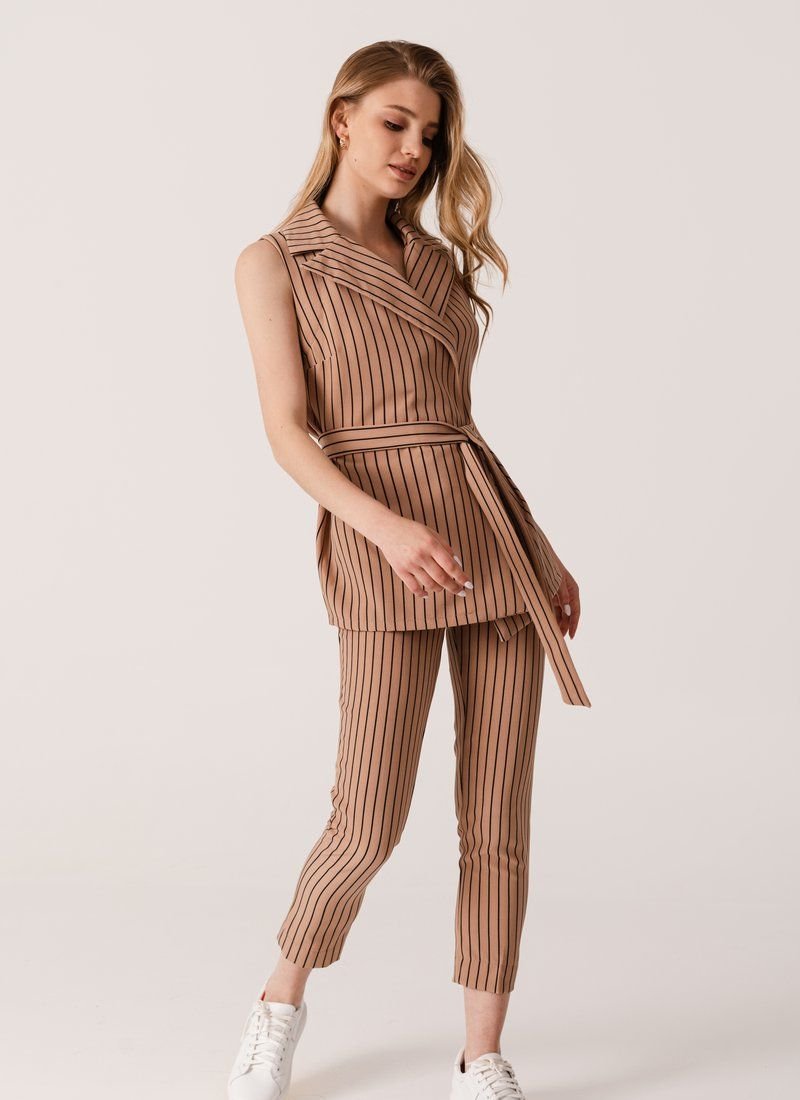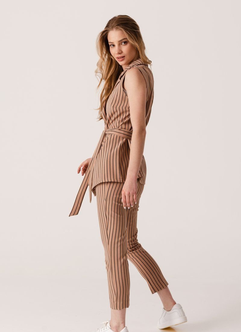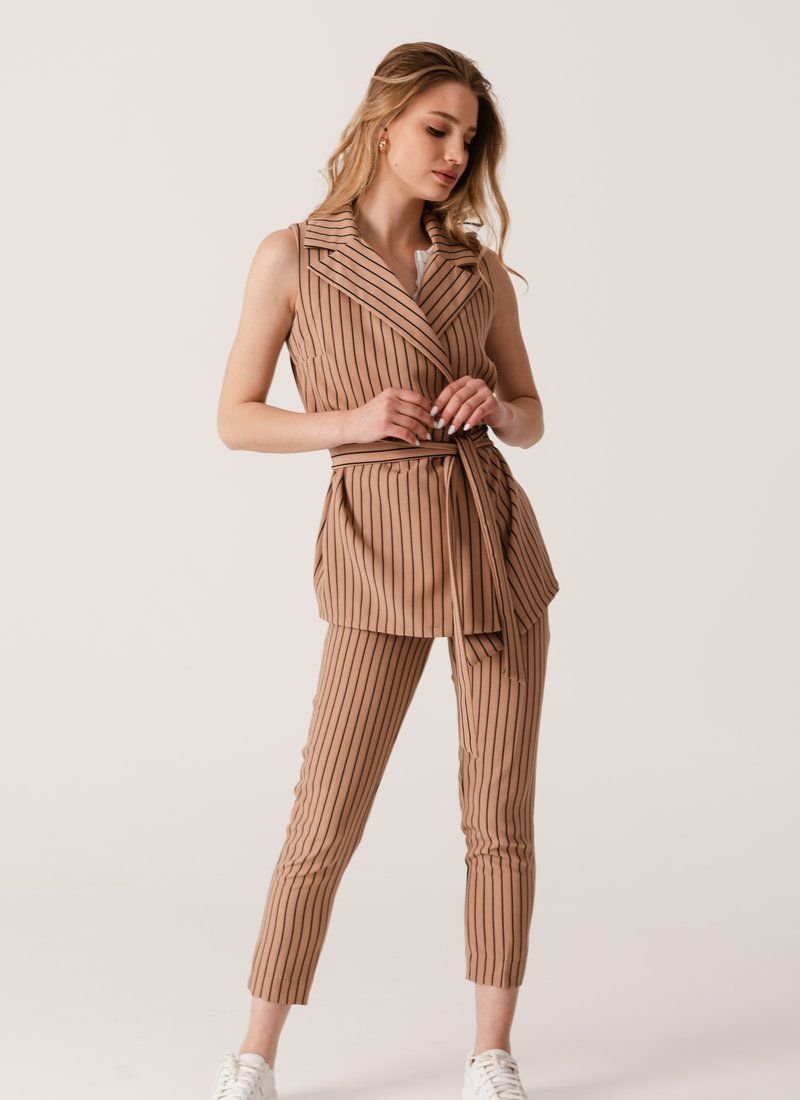 A striped print suit is a universal soldier in the wardrobe: the model will fit equally harmoniously into both office and casual attire. Soft and dense costume material was chosen for sewing models from cropped tight-fitting trousers and a jacket in a classic style. The waistline was formed with a belt-ribbon.