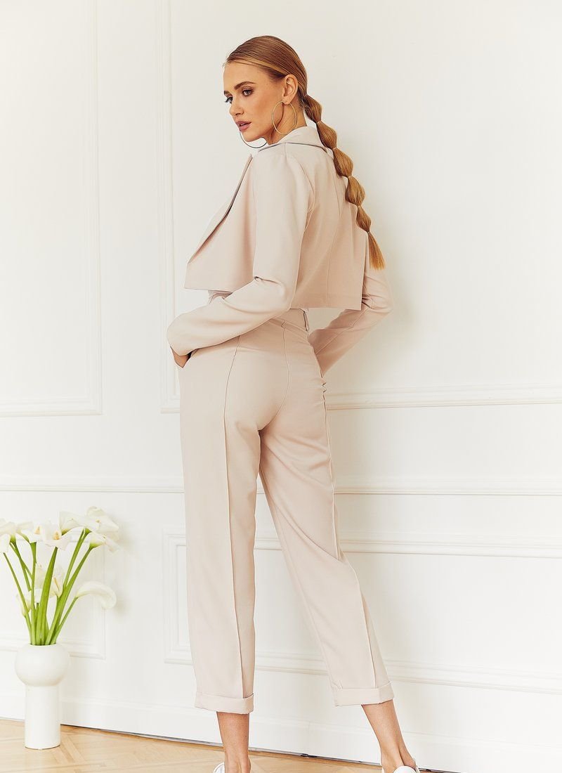 A suit of a basic beige shade will easily fit into your everyday wardrobe. The model supports the trend for a shortened cut, in the spirit of Alexander McQueen and Alberta Ferretti at the FW'20/21 shows. The jacket was supplemented with an imitation breast pocket, and the trousers with arrows and fixed lapels.