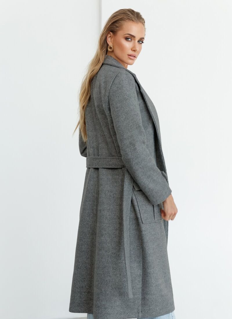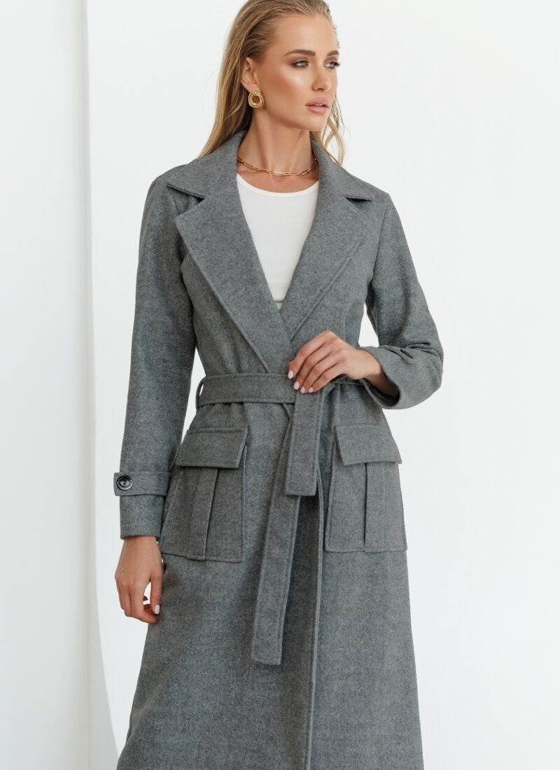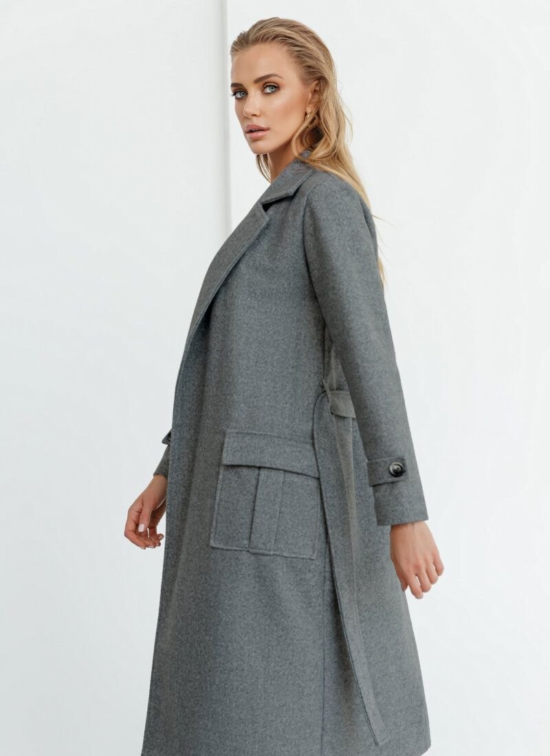 A versatile gray coat-jacket will be the finishing touch in the autumn look. The classic straight cut, turn-down collar with lapels and patch pockets with flaps place accents. A removable belt in color will favorably emphasize the waist.