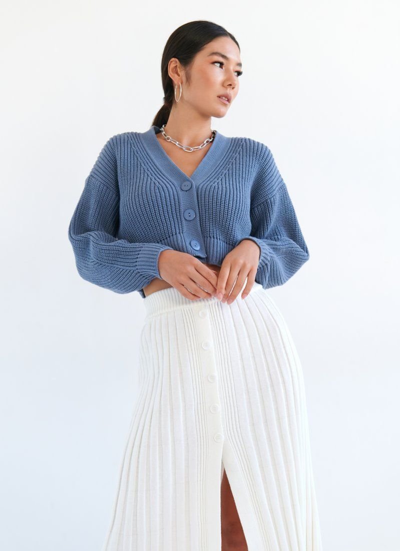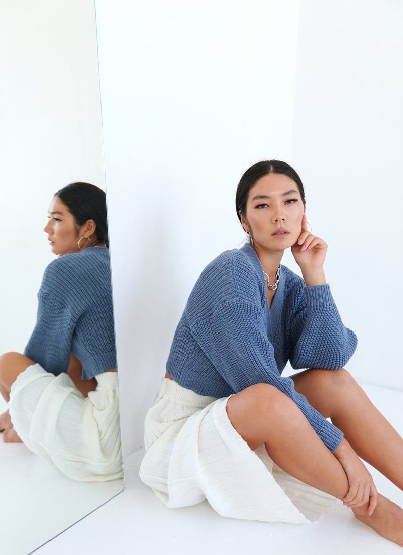 This collection features an indigo jumper. A feature of the model is a shortened cut, without focusing on buttons, as they match the tone of the product. An easily matched jumper will be a universal choice for any wardrobe.