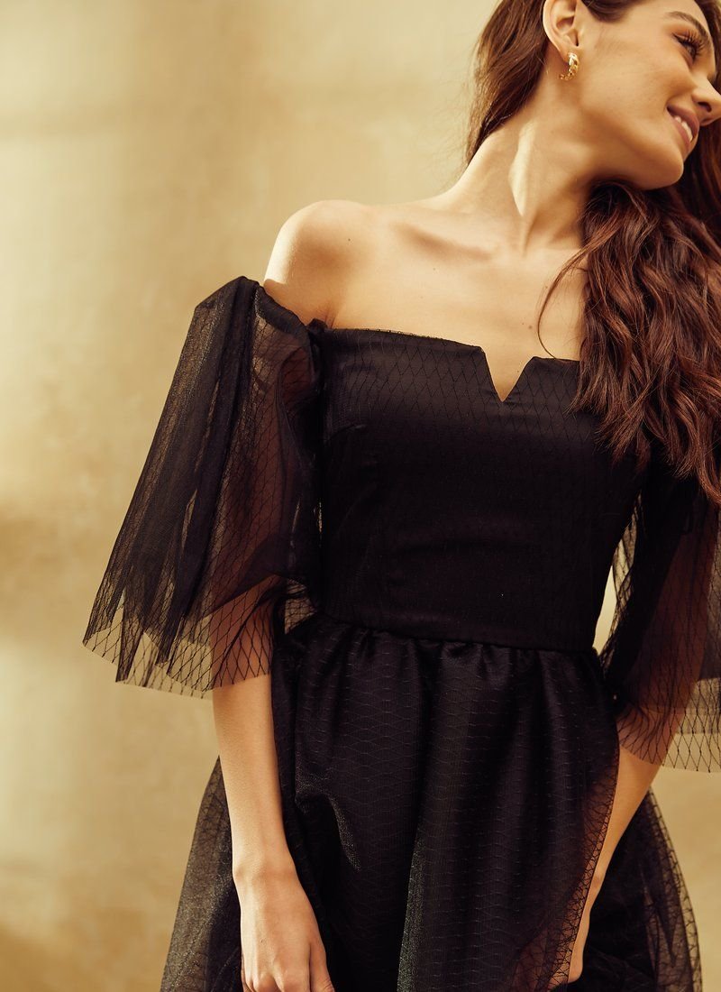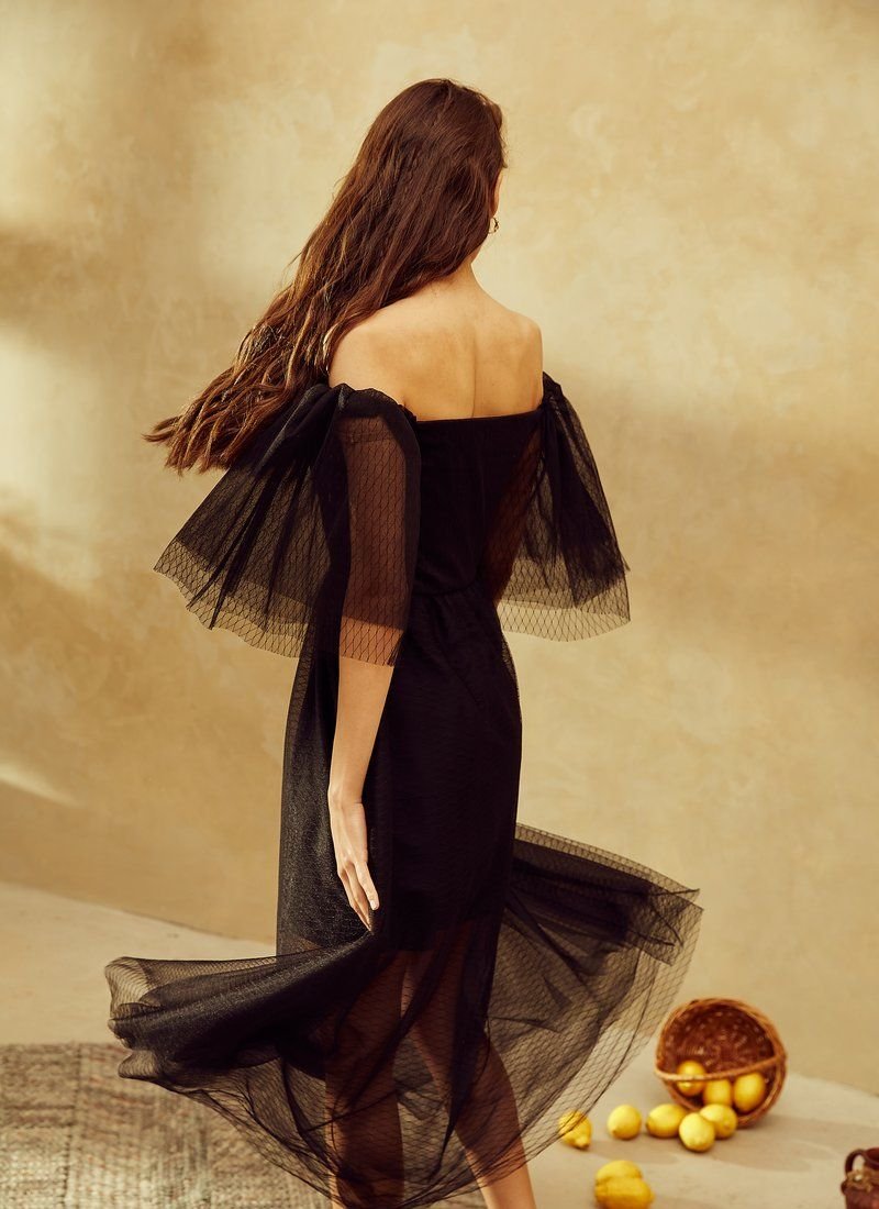 Such a detail as the lowered shoulder line is a fashionable technique of the evening look in the SS’21 season. A black fitted dress from Gepur designers will emphasize feminine fragility and grace, without forgetting about sensuality. The base of sliding silk was decorated with a double layer of airy mesh material with a flock coating in peas. The decollete area was emphasized with a curly neckline.