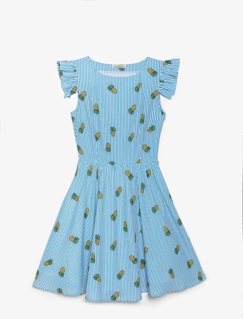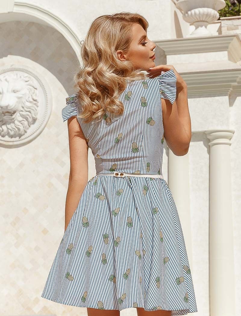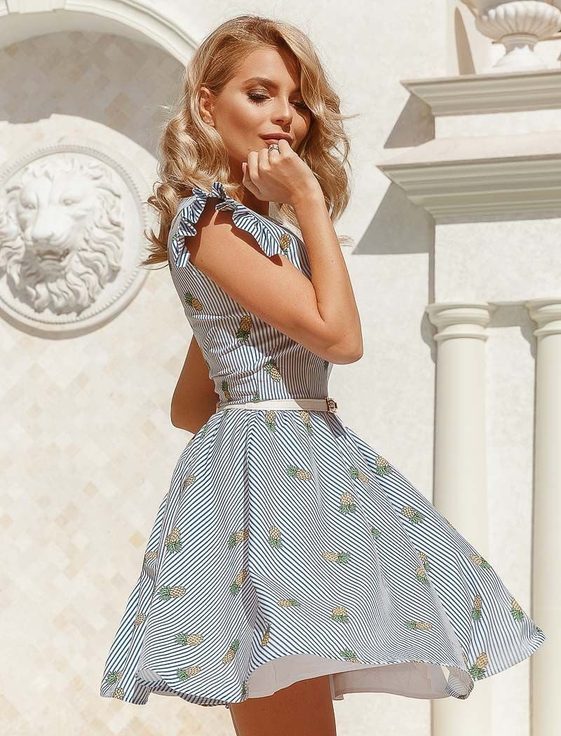 A stylish a-line dress, complemented by an eco-leather strap and a pinstripe print, from Gepur designers: short-wing sleeves, a boat neck, a cut-off waist and a half-sun skirt in a light fold.