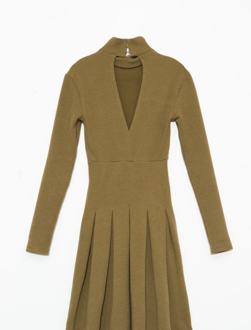 To create a model with a closed front and a small v-neck on the back, Gepur designers used soft textured knitwear. A high waist visually stretches the silhouette. At the same time, the skirt in a light fold adds charm and romance to the image.