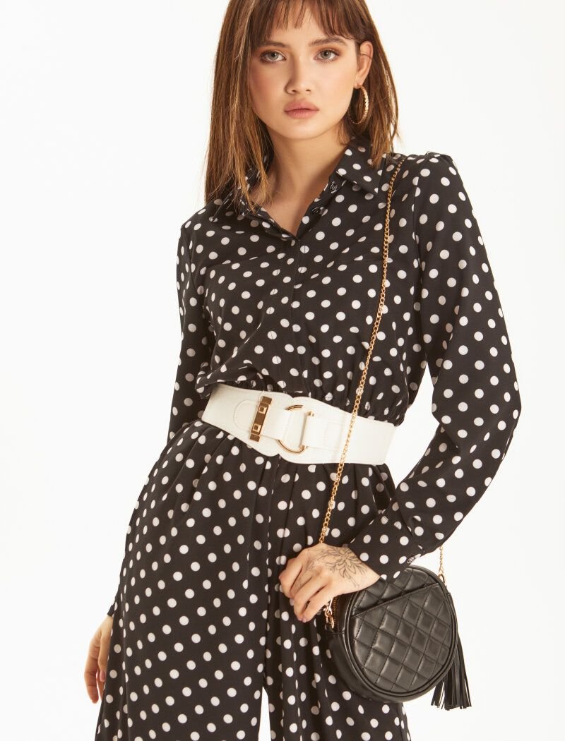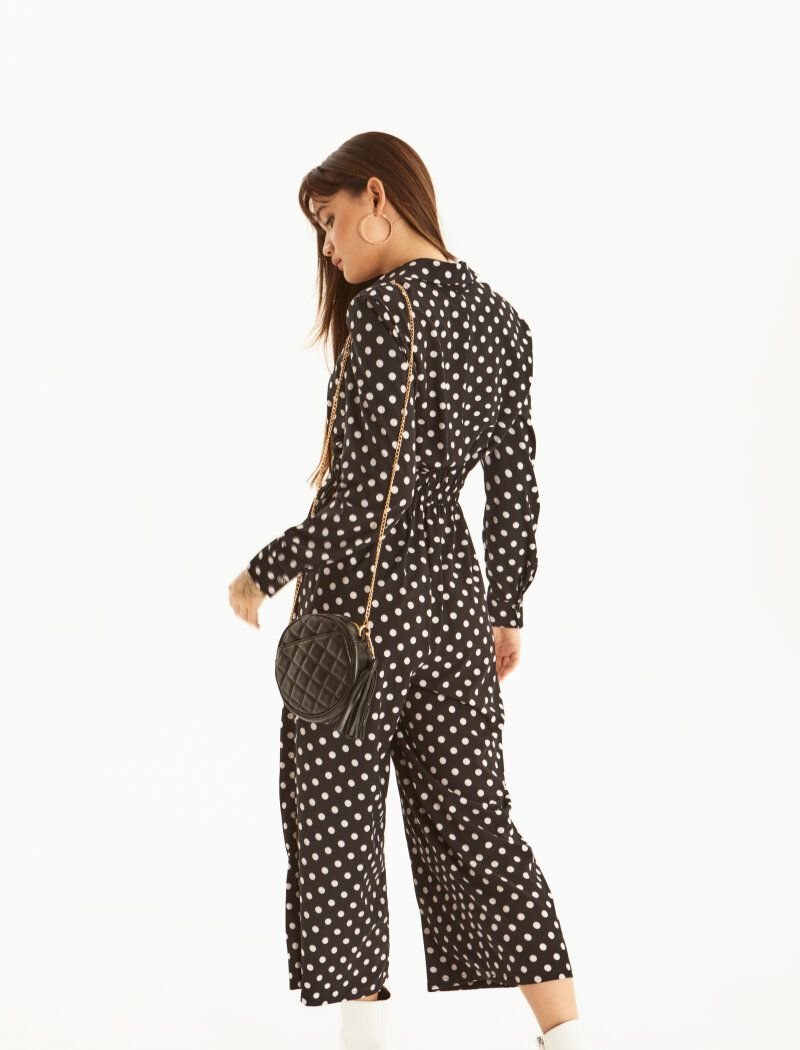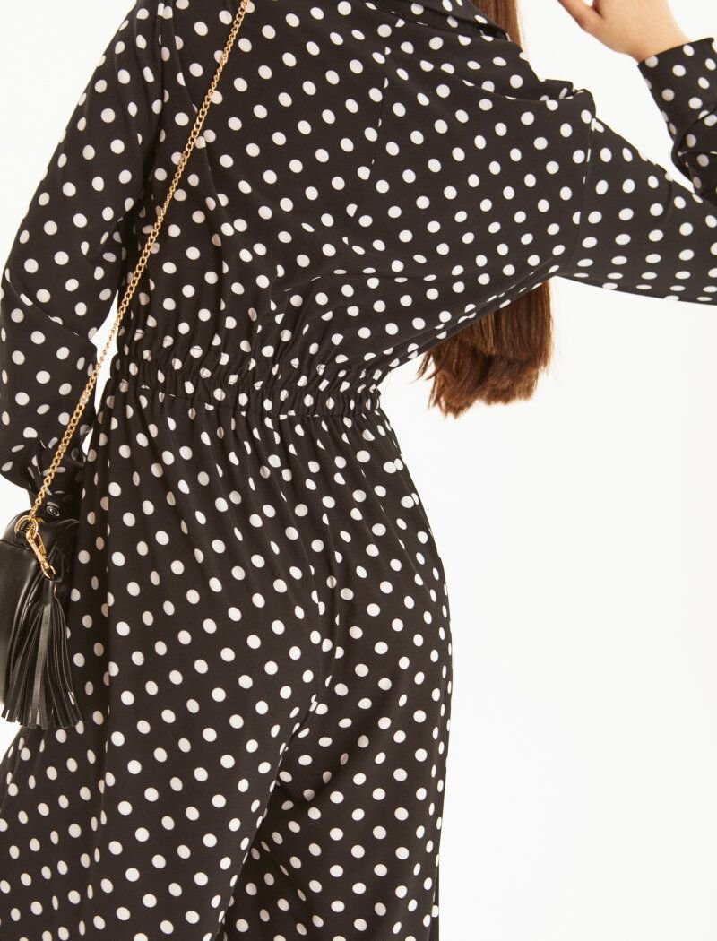 Trendy jumpsuit with contrasting polka dots. Turn-down collar, long sleeve with cuff. Hidden button placket, elastic insert at the waist and flared trousers with pockets in the seams.