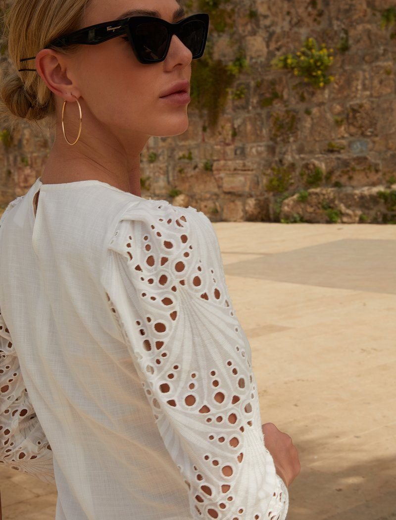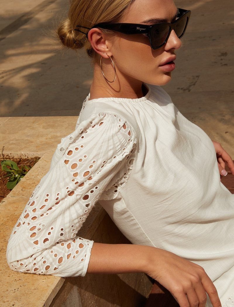 A short white Gepur dress does not look simple due to accent details: openwork 3/4 sleeves and a flounce at the hem. For sewing a model with a round neck, the designers chose a light cotton material that allows the skin to breathe in hot weather.
