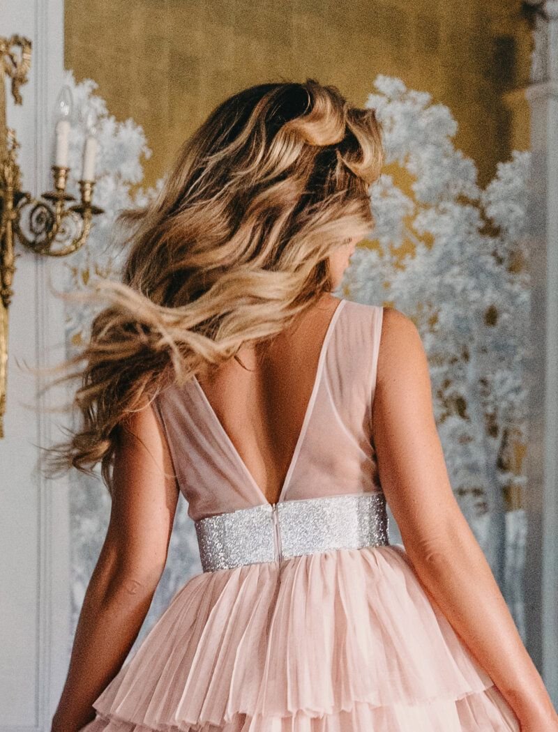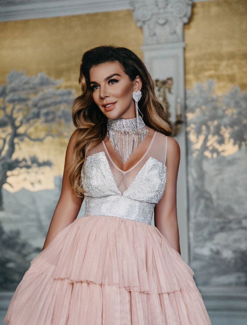 A multi-tiered short dress from Gepur designers: a deep v-shaped neckline, a shimmering yoke is woven from small silver-colored sequins, a wide cut-off waist, a multi-layered skirt made of weightless tulle gives the image a light romantic flair. The star collection is presented by the famous singer Anna Sedokova.