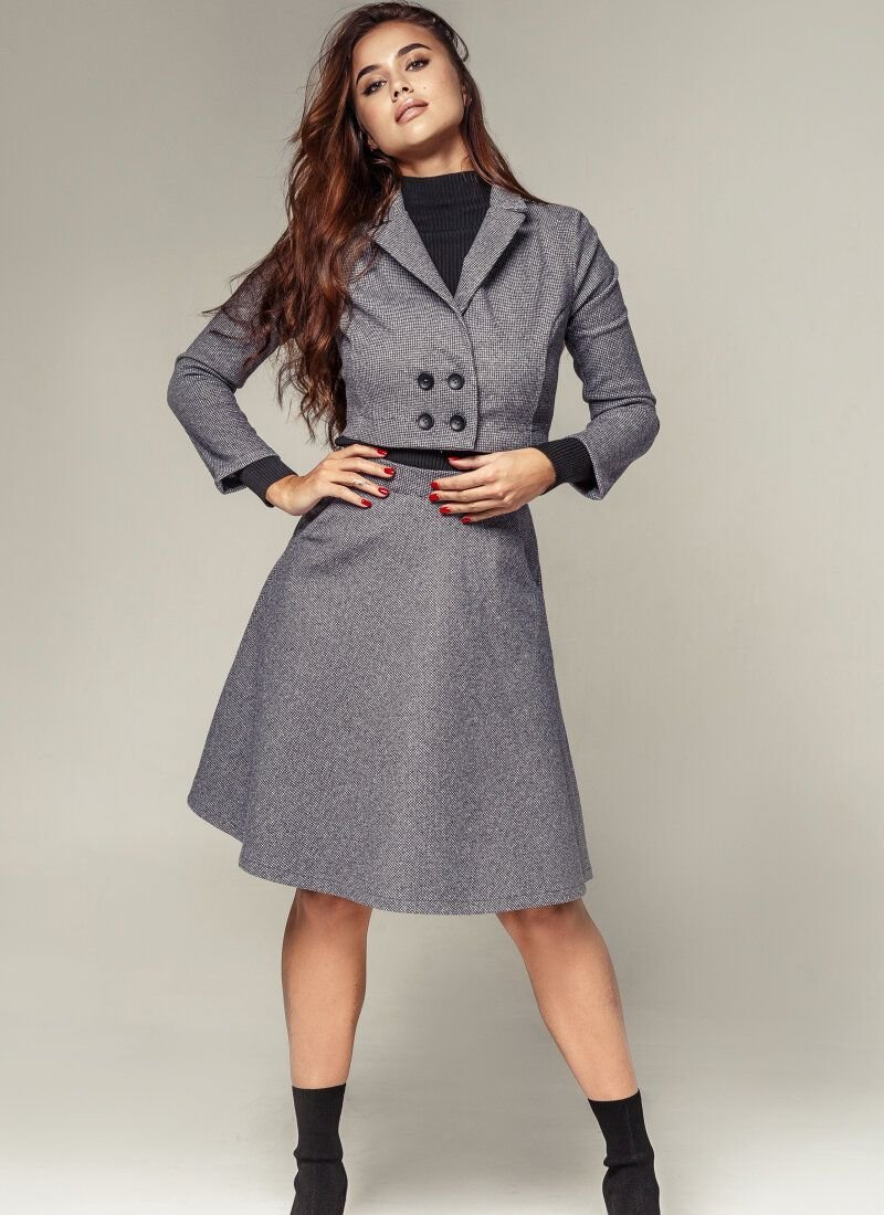 The flared midi skirt is cleaned of all possible details, focusing on soft material with a trendy "crow's foot" print. The model was supplemented with side pockets.