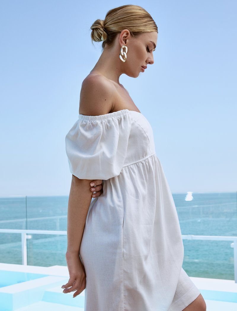The white dress successfully copes with multitasking, organically fitting both into the image for a holiday by the sea and into an everyday bow. For sewing a model with an open shoulder line and voluminous sleeves, we chose a light material-eco-linen.