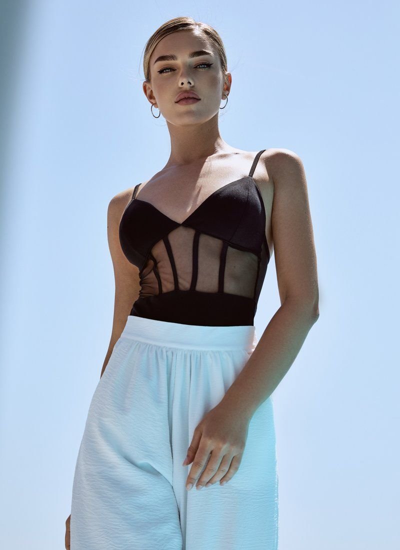 Despite the black color, the bodysuit looks provocative. The model with rigid cups was decorated with inserts of translucent mesh material.