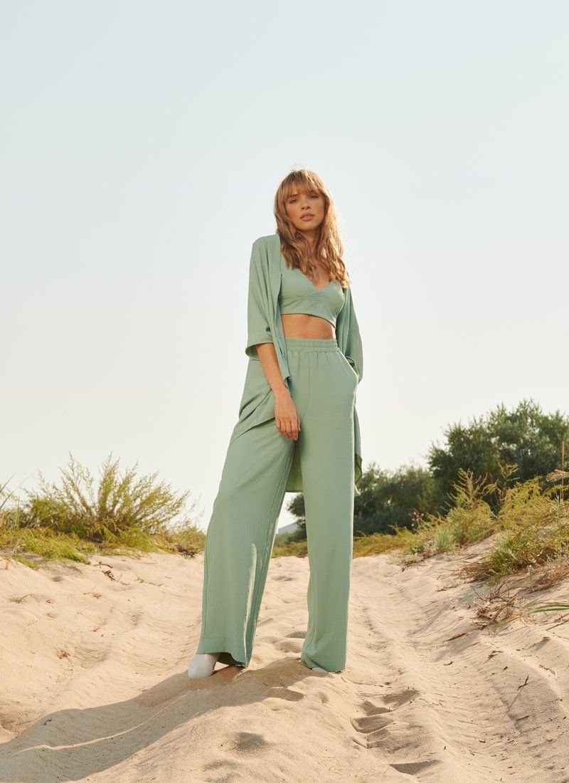 Comfortable casual three-piece set made of soft pressed mint-colored fabric. It includes a crop top with thin straps with an elastic back, flared trousers with a high fit and two pockets on the sides, as well as a loose cardigan with short sleeves.
