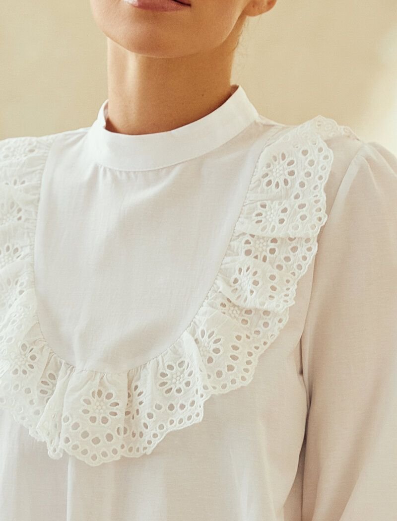 The new Gepur collection includes a white mini-dress. For sewing the model of a loose A-silhouette, a light cotton-based fabric was used, which allows the skin to breathe. A flounce with embroidery helps to emphasize the decollete area. The cuffs on the long sleeves are made of the same material.