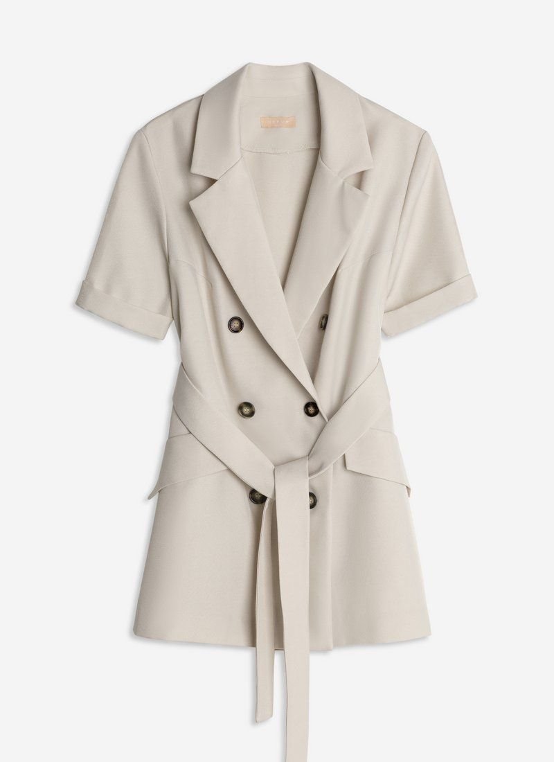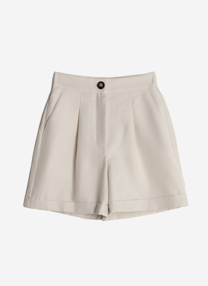The original costume from Gepur designers, made of ivory-colored costume fabric: a double-breasted jacket with short sleeves, contrasting buttons and a removable belt to match, shorts with a high fit and lapels.