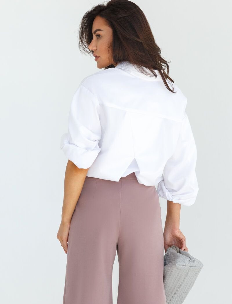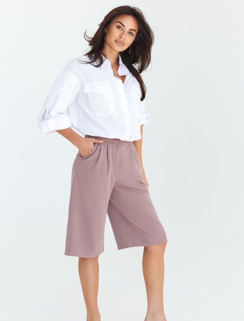 Bermuda shorts skillfully balance between relaxation and restraint, which is given to them by a classic cut and asymmetric pinches at the waist. The material gives the product a cold shine. Welt pockets provide additional comfort.