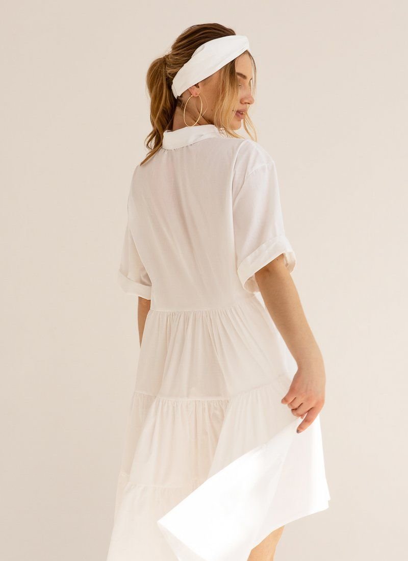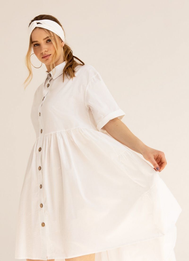 The white dress resembles an asymmetrical shirt of the oversize silhouette, which was supported by Prada and Balenciaga in their FW'20/21 collections. Soft cotton was used for sewing the model. Short sleeves were supplemented with unfixed lapels. The set includes a headband with a voluminous weave.