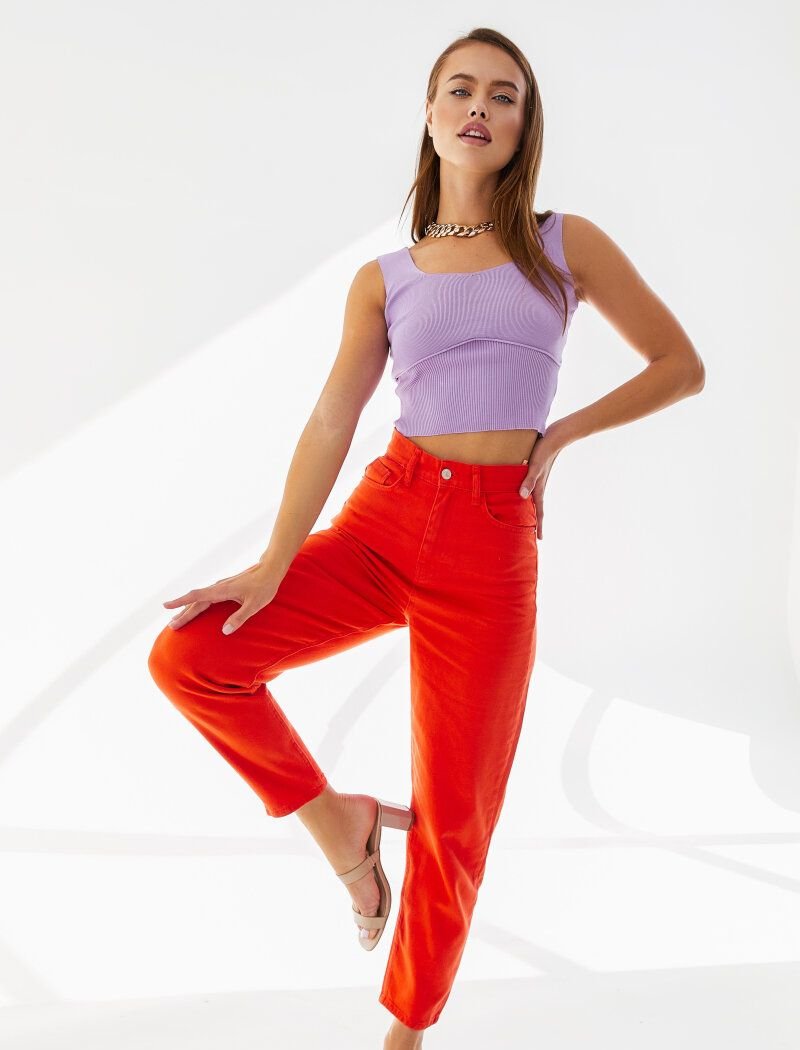 Bright jeans will become a worthy alternative to the usual blue or blue models: a rich orange shade will refresh during city walks. For sewing the product, soft cotton was used, which holds its shape perfectly.