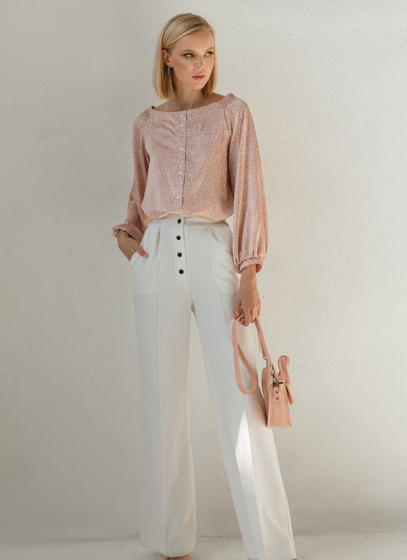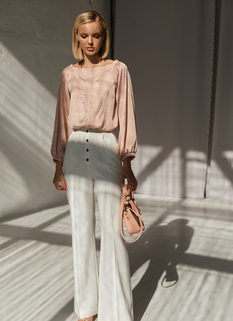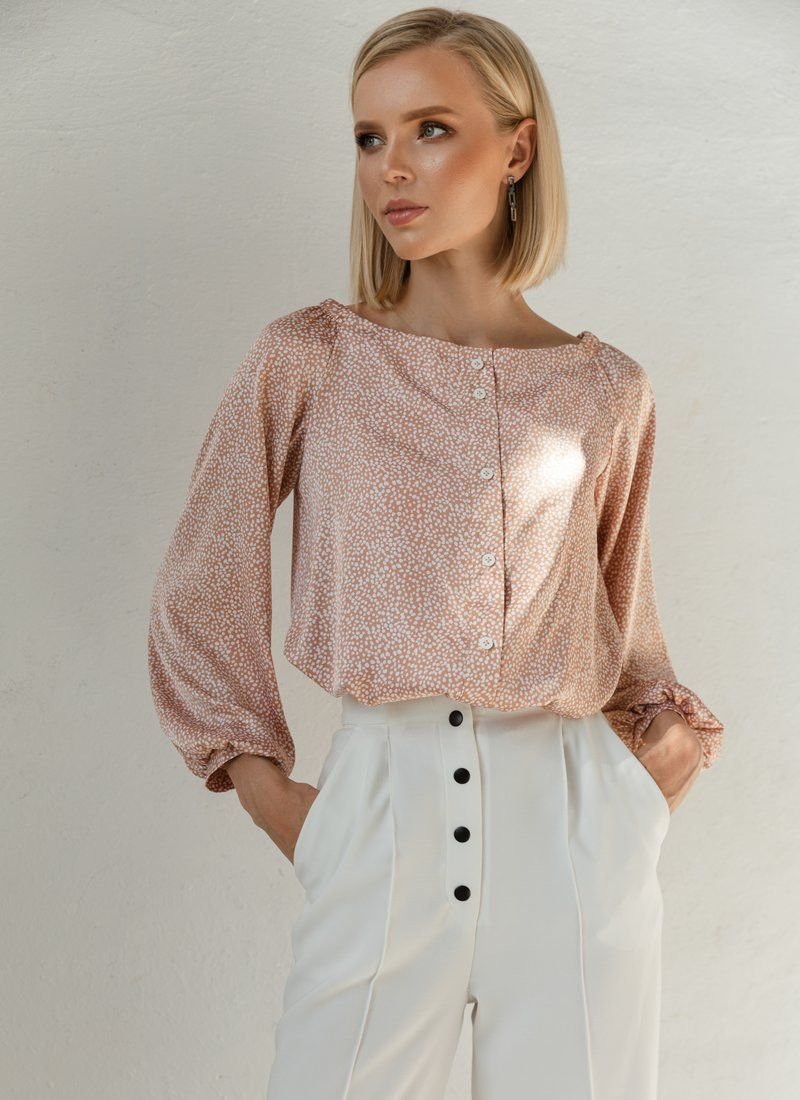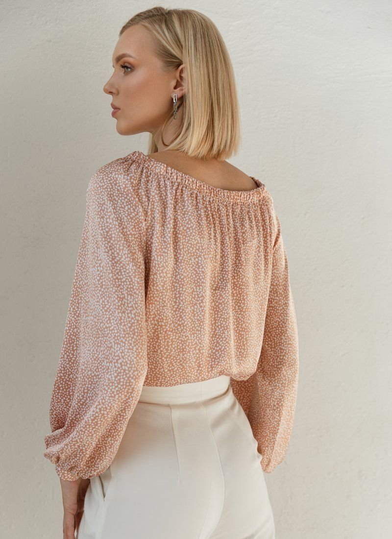 Beige silk blouse with small white polka dots, with a boat neck and an elastic insert on the back. Buttons on the front, long loose sleeve with thin cuffs.