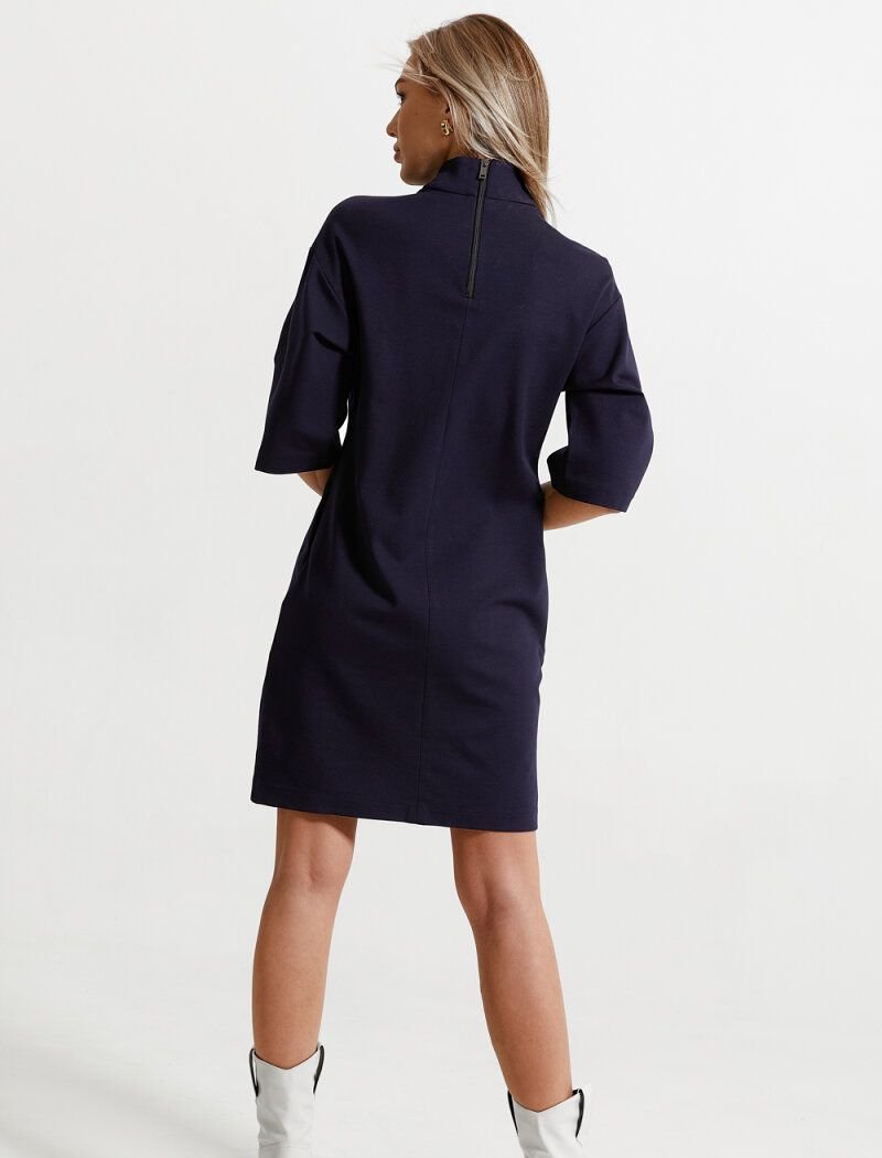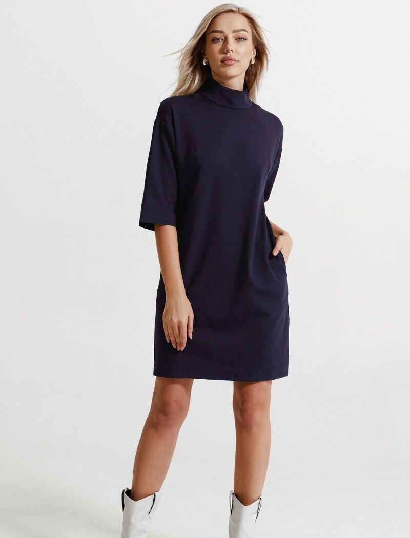 For sewing a mini dress of a dark blue shade, Gepur designers used dense knitwear. The laconic style with a stand-up collar and 1/2 sleeves can be adapted both for a comfortable everyday look and for an office dress code.