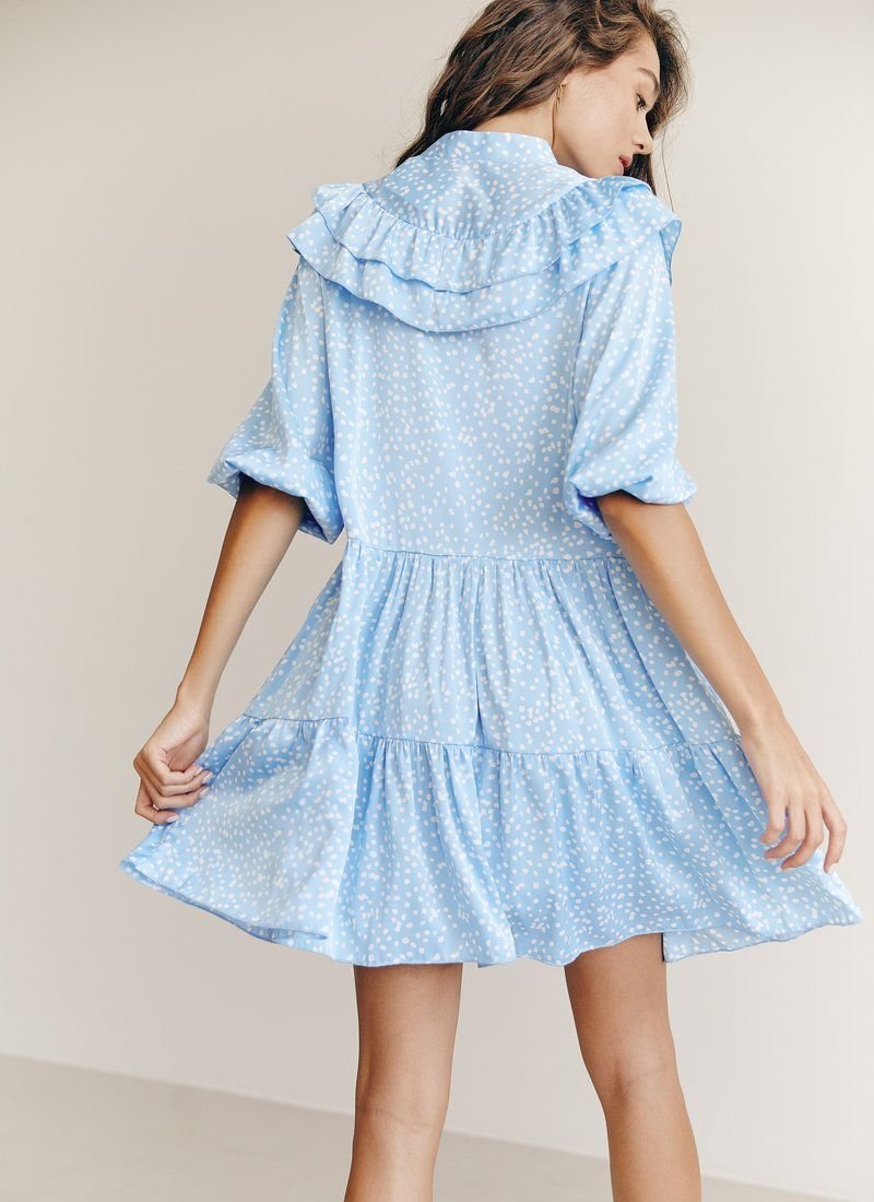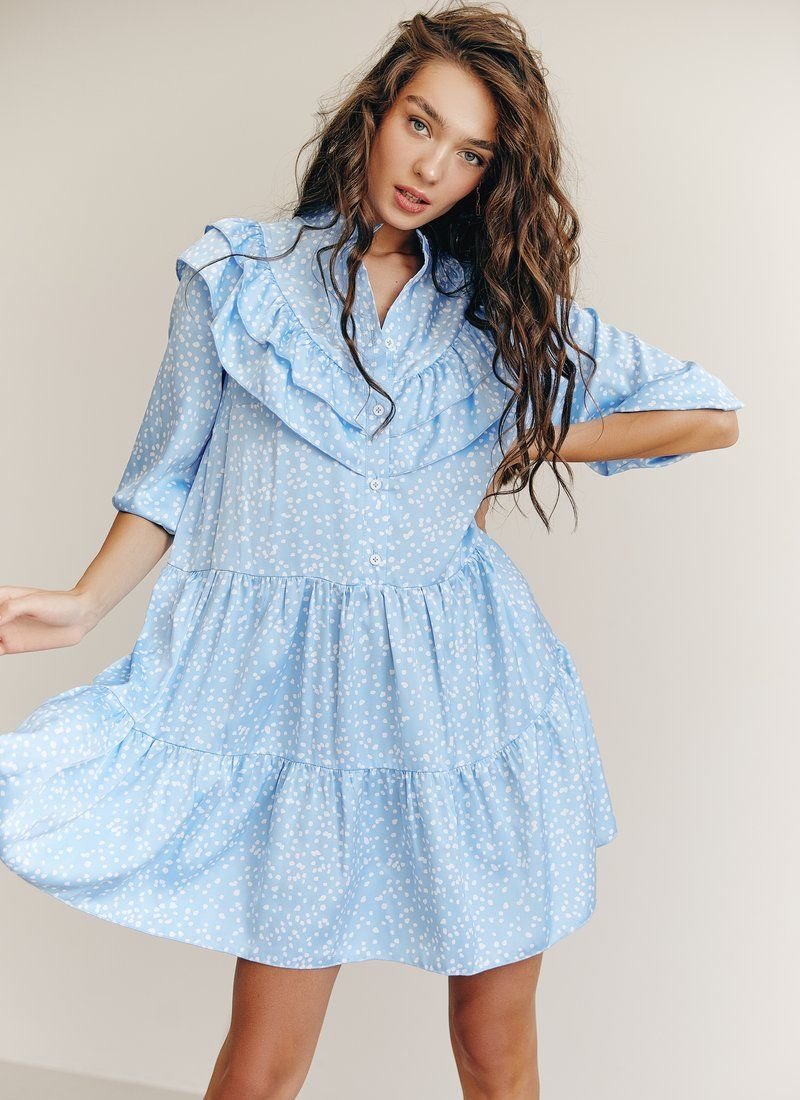 A very light and delicate blue polka dot dress with a loose cut, with a buttoned collar in front, with neat ruffles on the chest and a frill on the skirt. Cropped sleeve with elastic insert. Made of a nice soft fabric that will make your look airy.