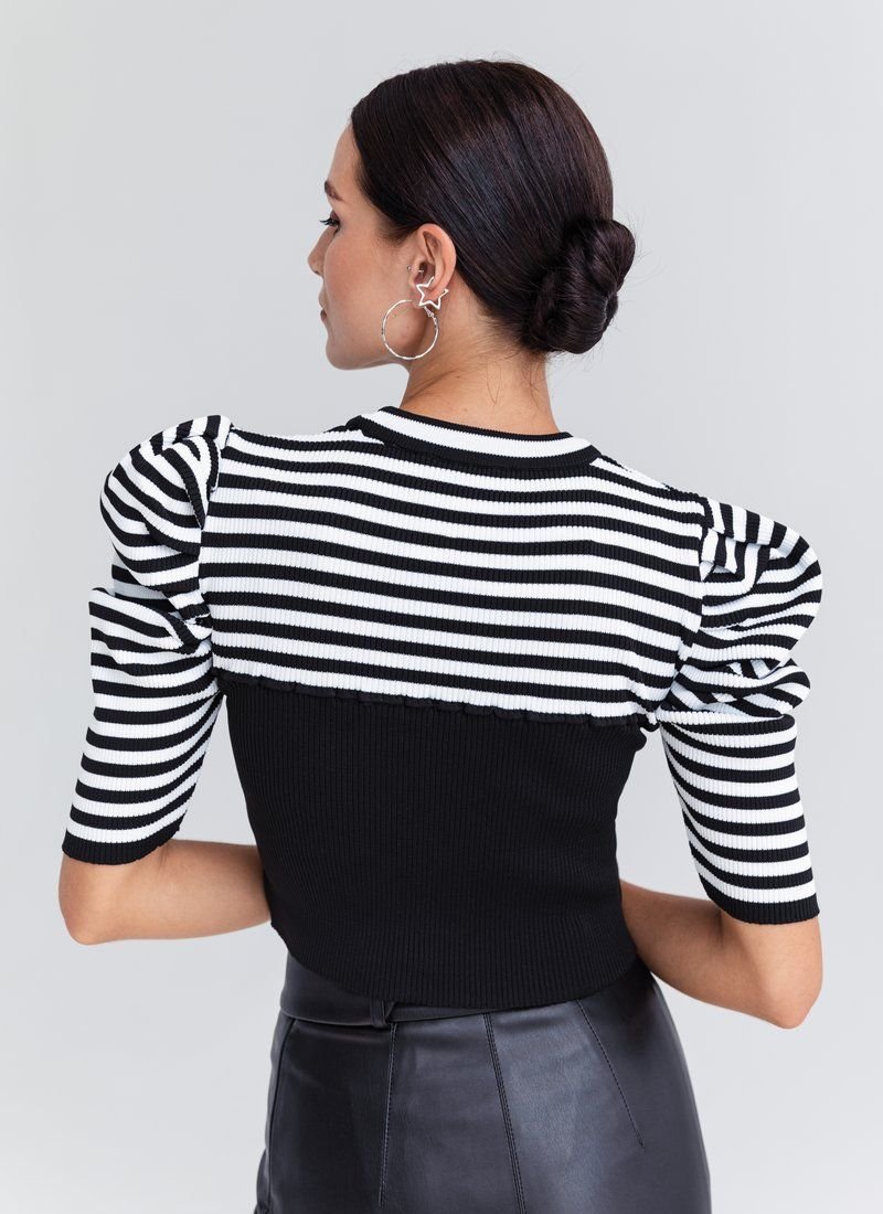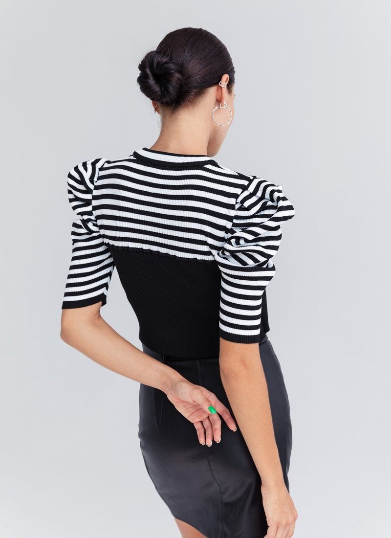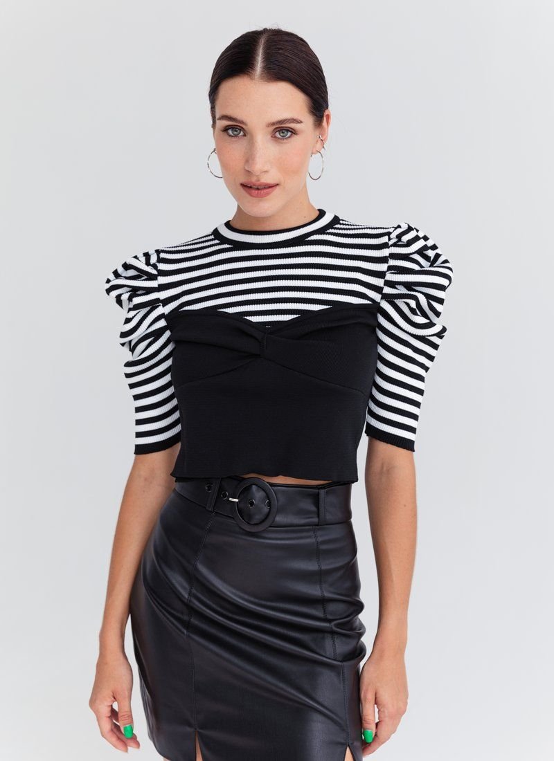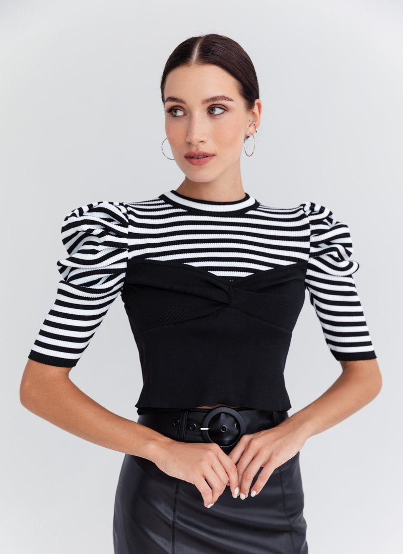 Knitted cropped top with imitation of a corset, the top of the product is made in black and white stripes. The sleeves of the top are decorated with puffs.