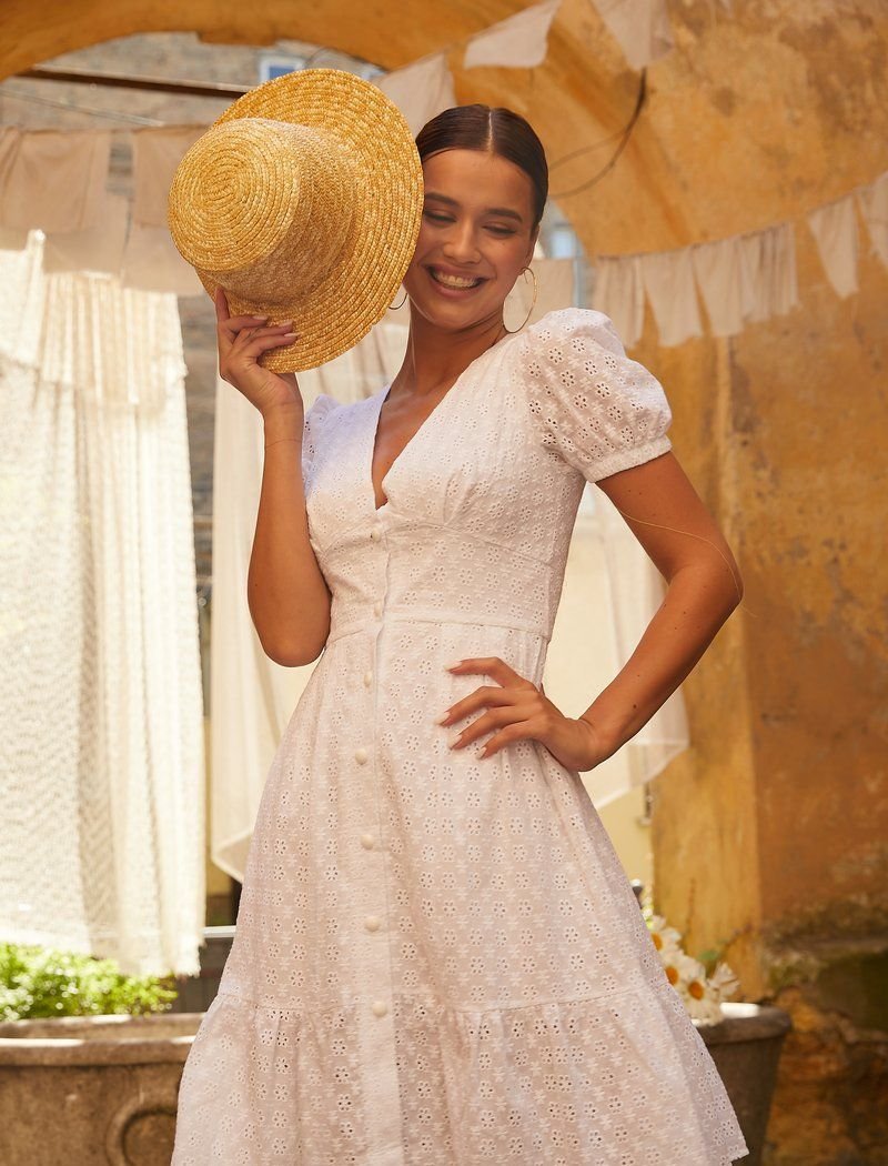 Stylish summer dress with buttons, made of cotton fabric with floral embroidery. A neat triangular cutout on the chest, a short flashlight sleeve with an elastic cuff, a figured waistband and a flared skirt decorated with a flounce.
