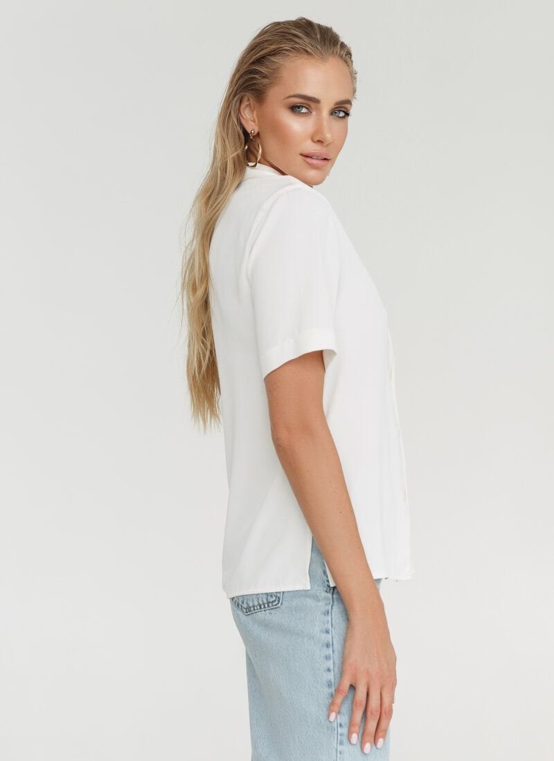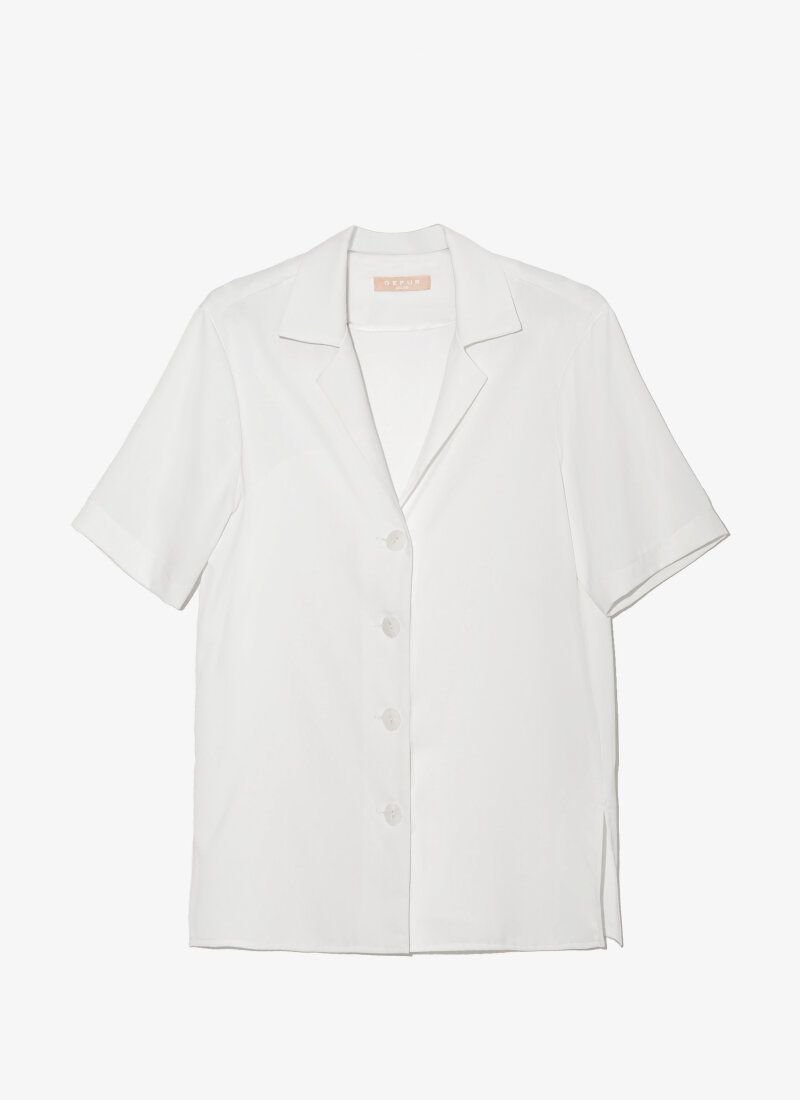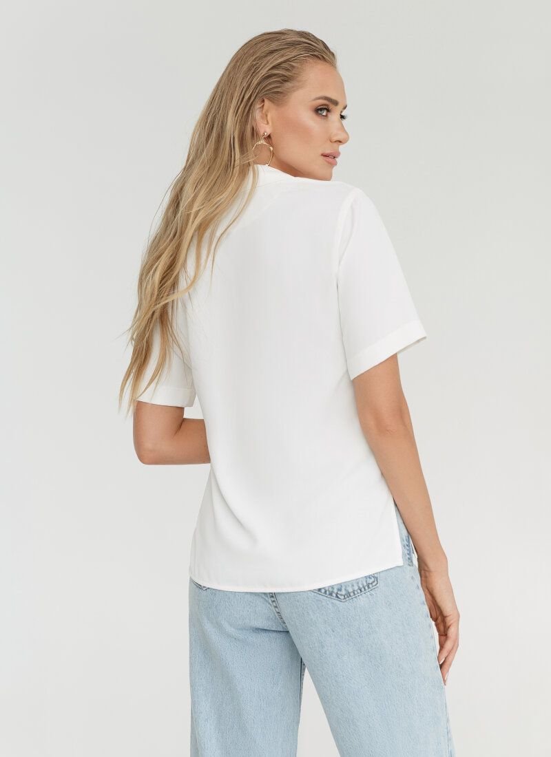 Laconic blouse in white. A turn-down collar with lapels gives the model rigor. The model is complemented with buttons on the front.