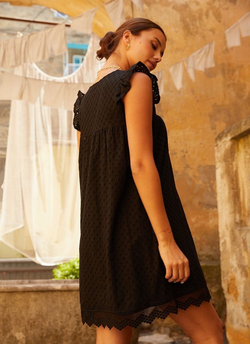 A light, loose-fitting dress made of cotton fabric with floral embroidery. The neat yoke of the dress is decorated with a v-neck and wing sleeves. The dress is complemented by two small pockets in the seams and lace trim at the hem.