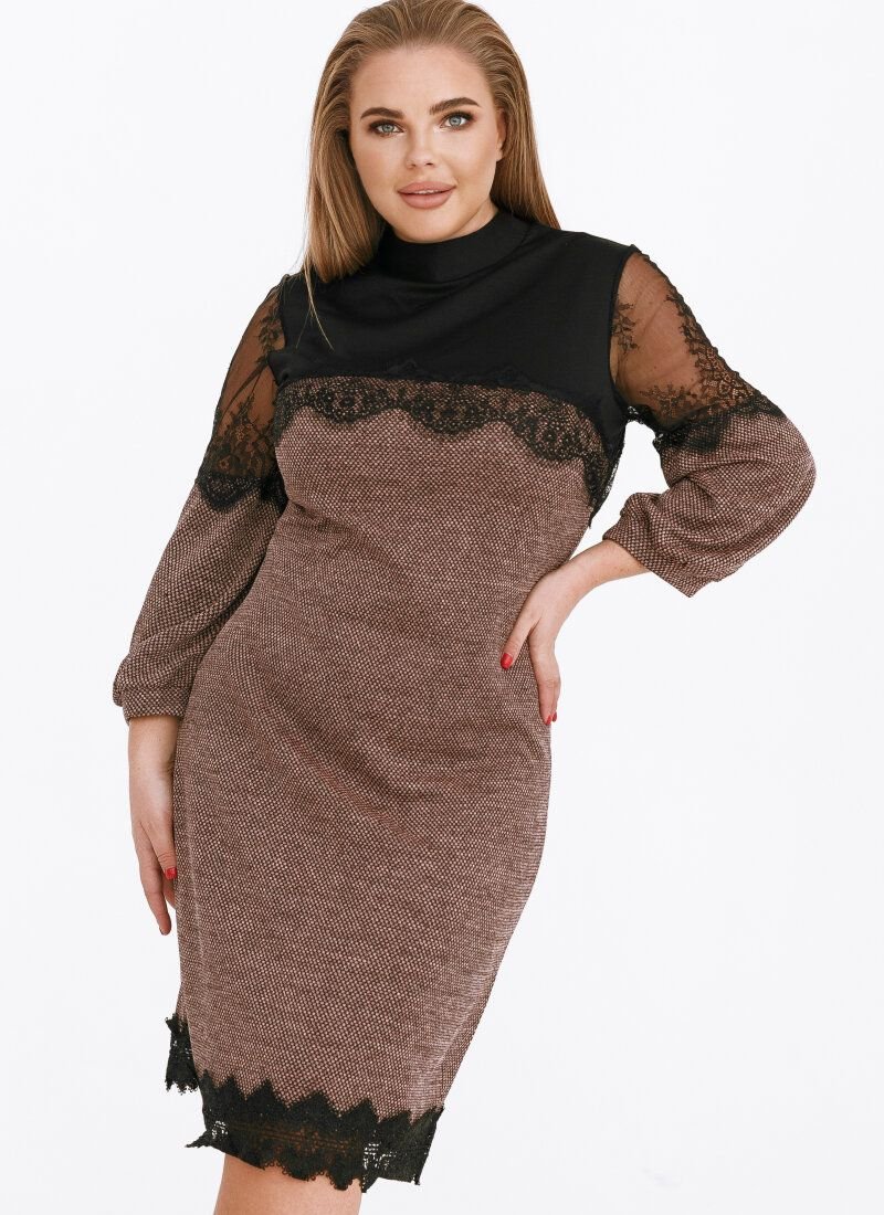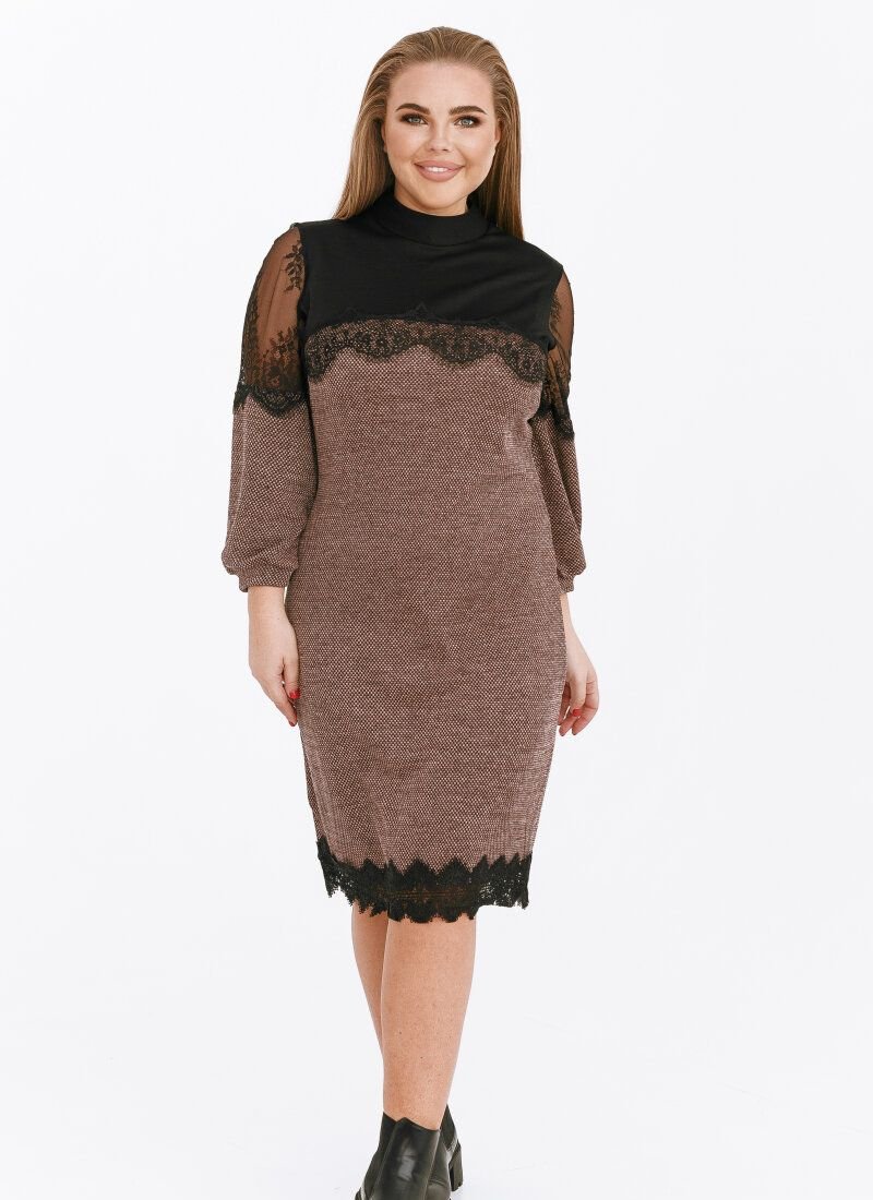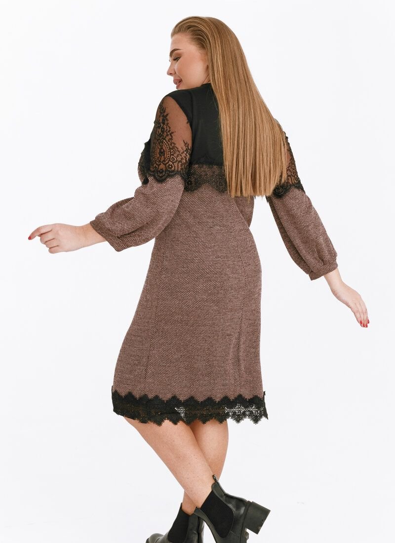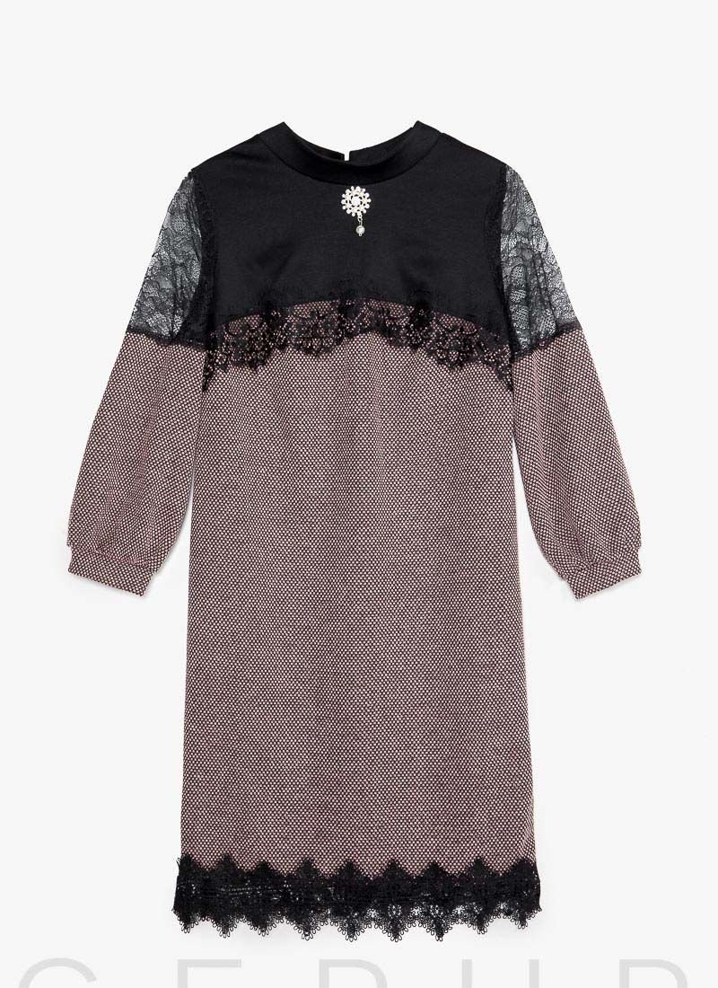 Elegant mini dress with a neat stand-up collar, 7/8-length sleeve with lace inserts, complemented by a removable brooch.
