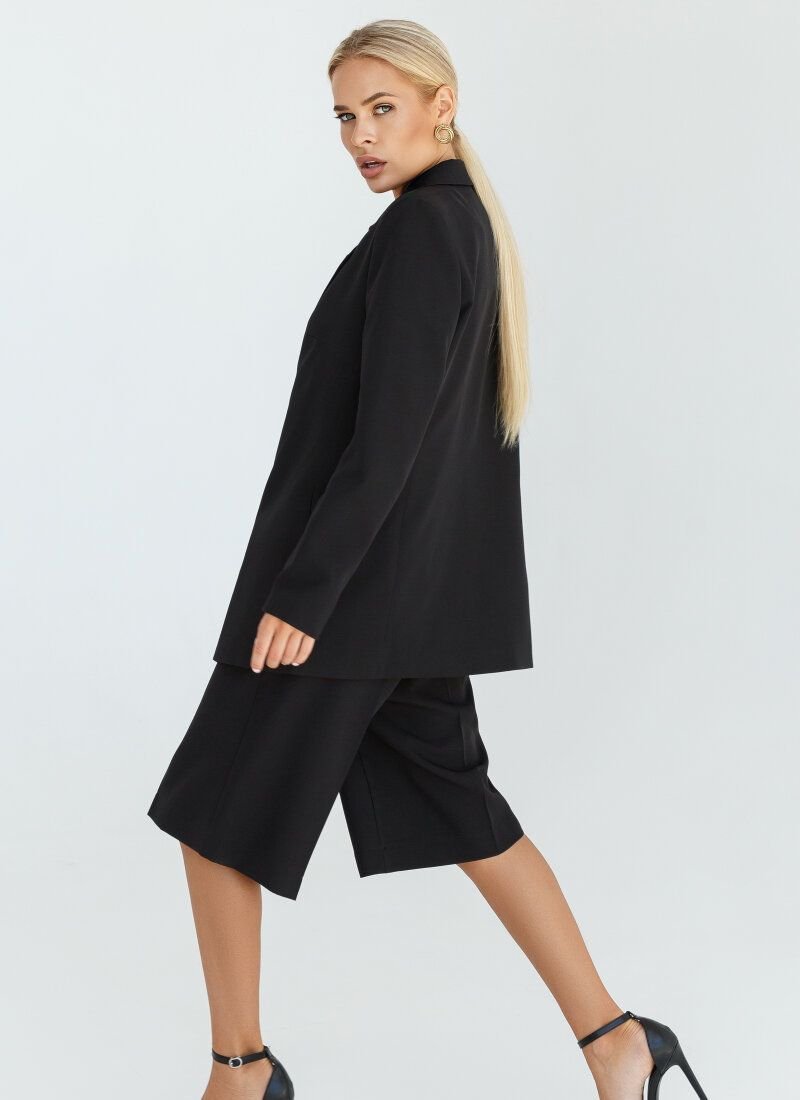 The black suit is suitable both for the office and for evening walks. Double-breasted jacket with a turn-down collar with lapels. Bermuda shorts with a high fit and fixed arrows. The composition of the material adds shine to the model. The jacket and shorts are complemented by welt pockets.