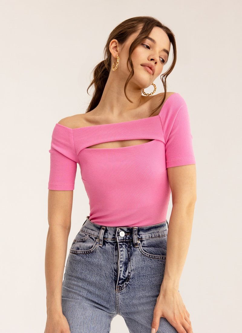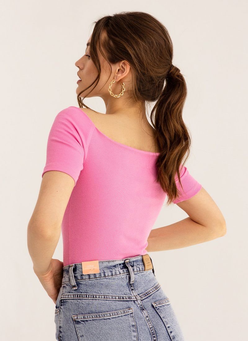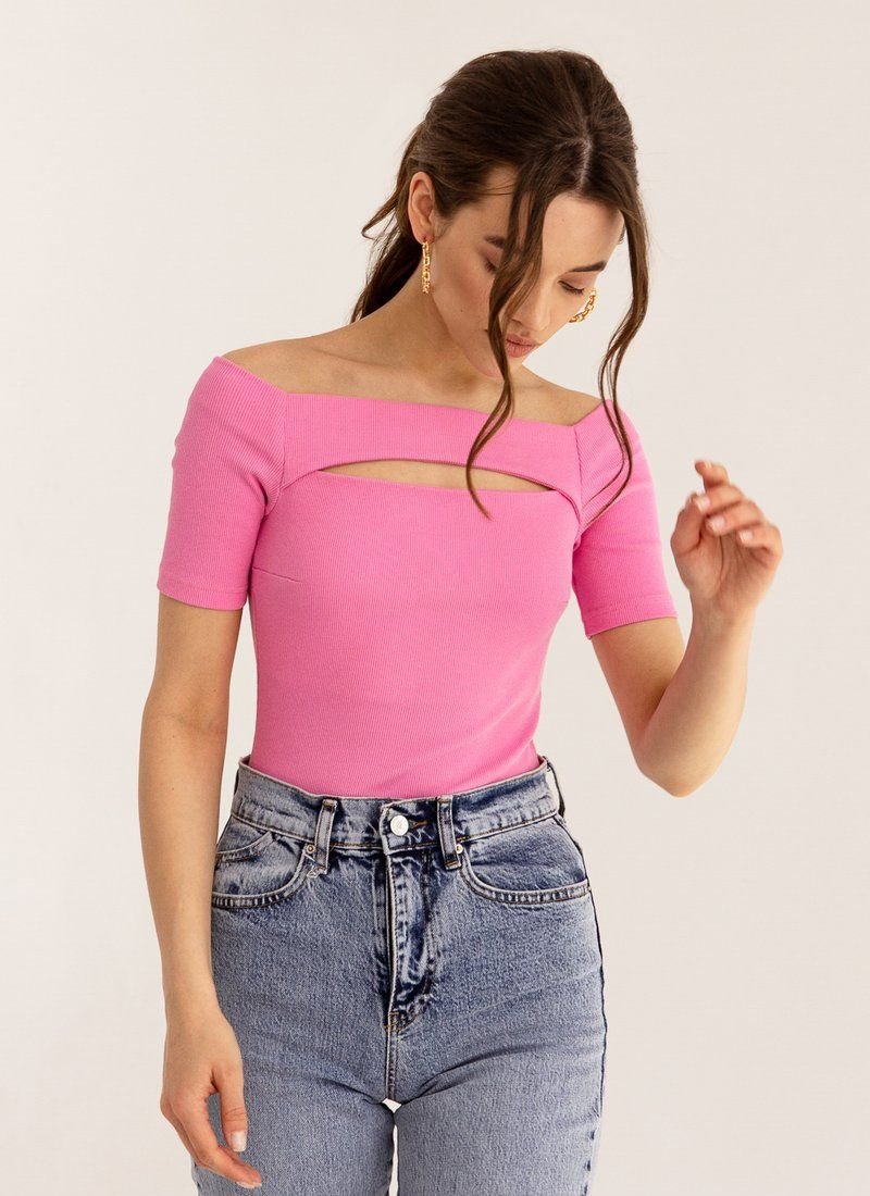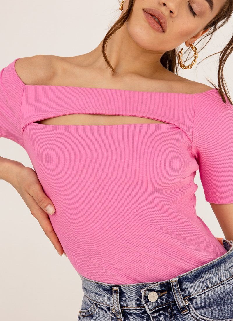 The finely ribbed bodysuit is made of soft and comfortable knitwear in a shade of fuchsia. The form-fitting cut emphasizes the dignity of the figure. The model is complemented by a curly neckline, which puts an emphasis on the decollete area.