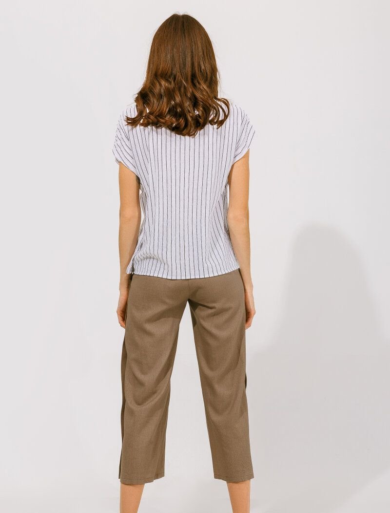 Cropped linen trousers with a high waist on an elastic insert. Straight cut, decorative straps with buttons on the side seams.