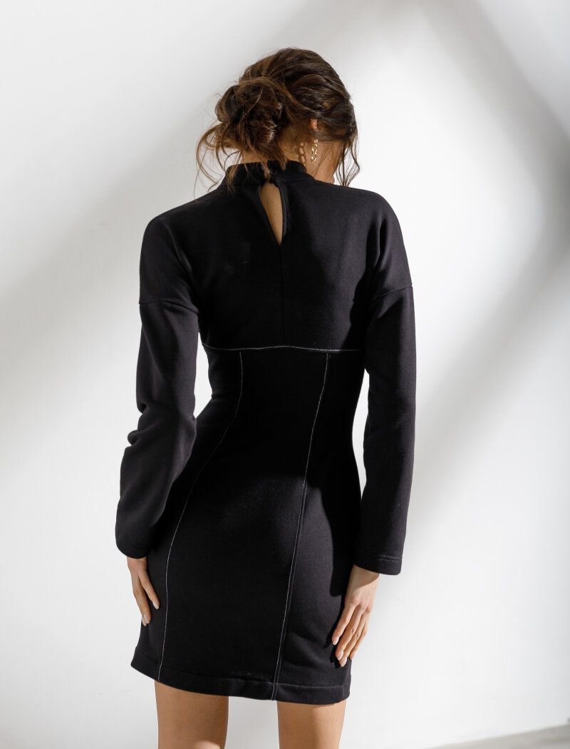 It will not be difficult to create an expressive image for a black dress from the new Gepur collection. The designers set the right mood with the help of a mini length, a tight cut and contrasting stitches. For the production of a model with a stand-up collar, a soft knitted material was used.