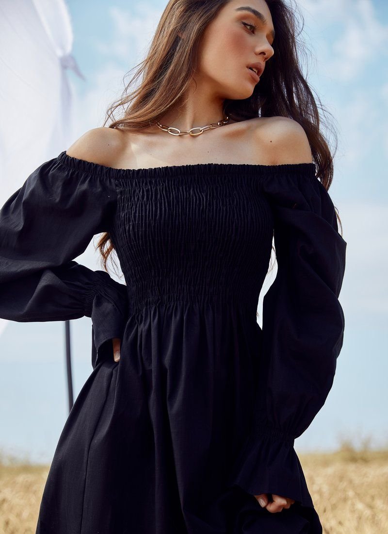A romantic off-the-shoulder dress looks spectacular. The basic black color, elastic bodice and long voluminous sleeves work for this. The mood is also supported by the material: the model was sewn from linen.